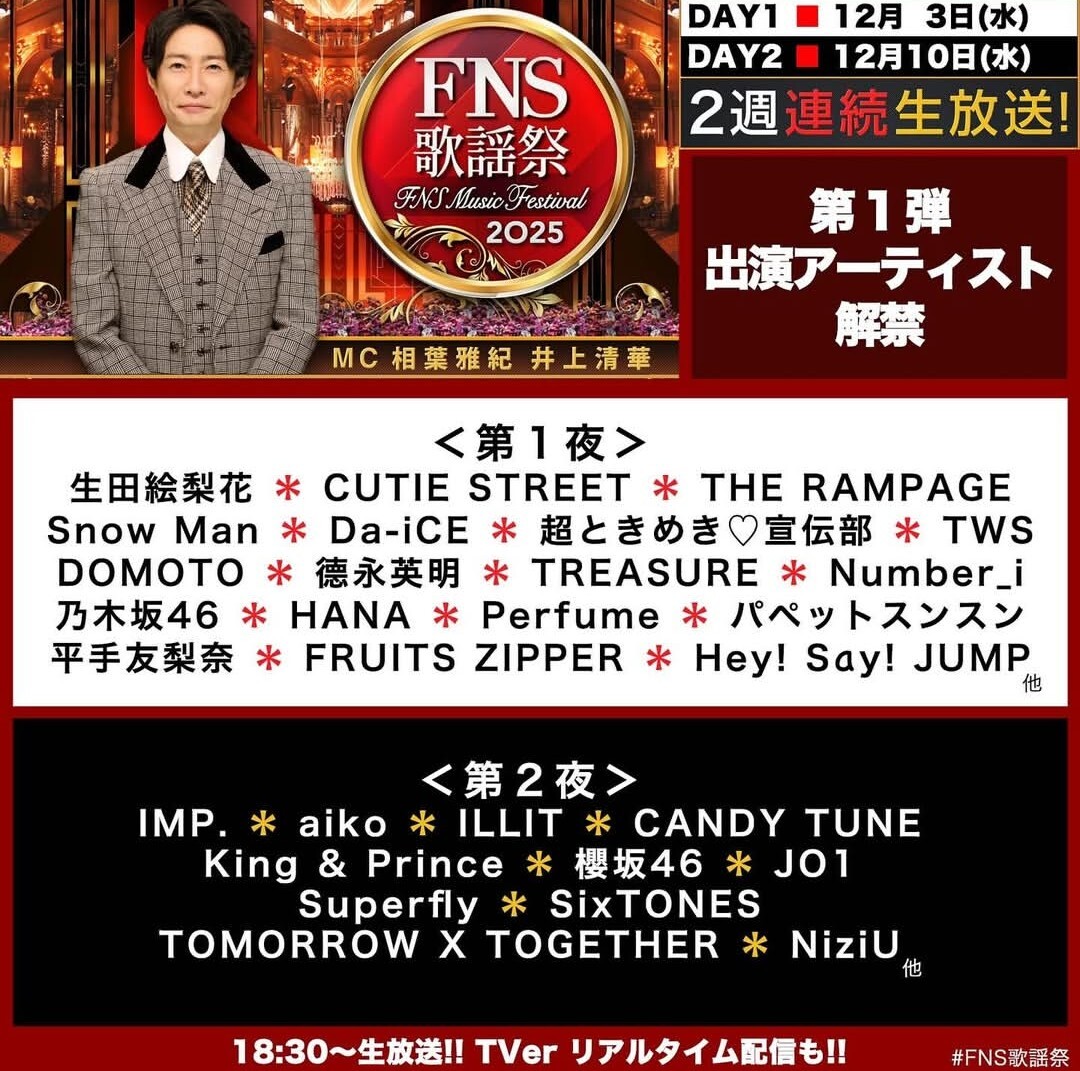 📺出演情報 / TV Appearance 📺 🗓️12月3日(水)18:30~23:18 フジテレビ系列「2025 FNS 歌謡祭 第1夜」 - - - 🗓️December 3 (Wed) 18:30 - 23:18 JST Fuji TV "2025 FNS Music Festival" @fns_kayousai #FNS歌謡祭 #Number_i