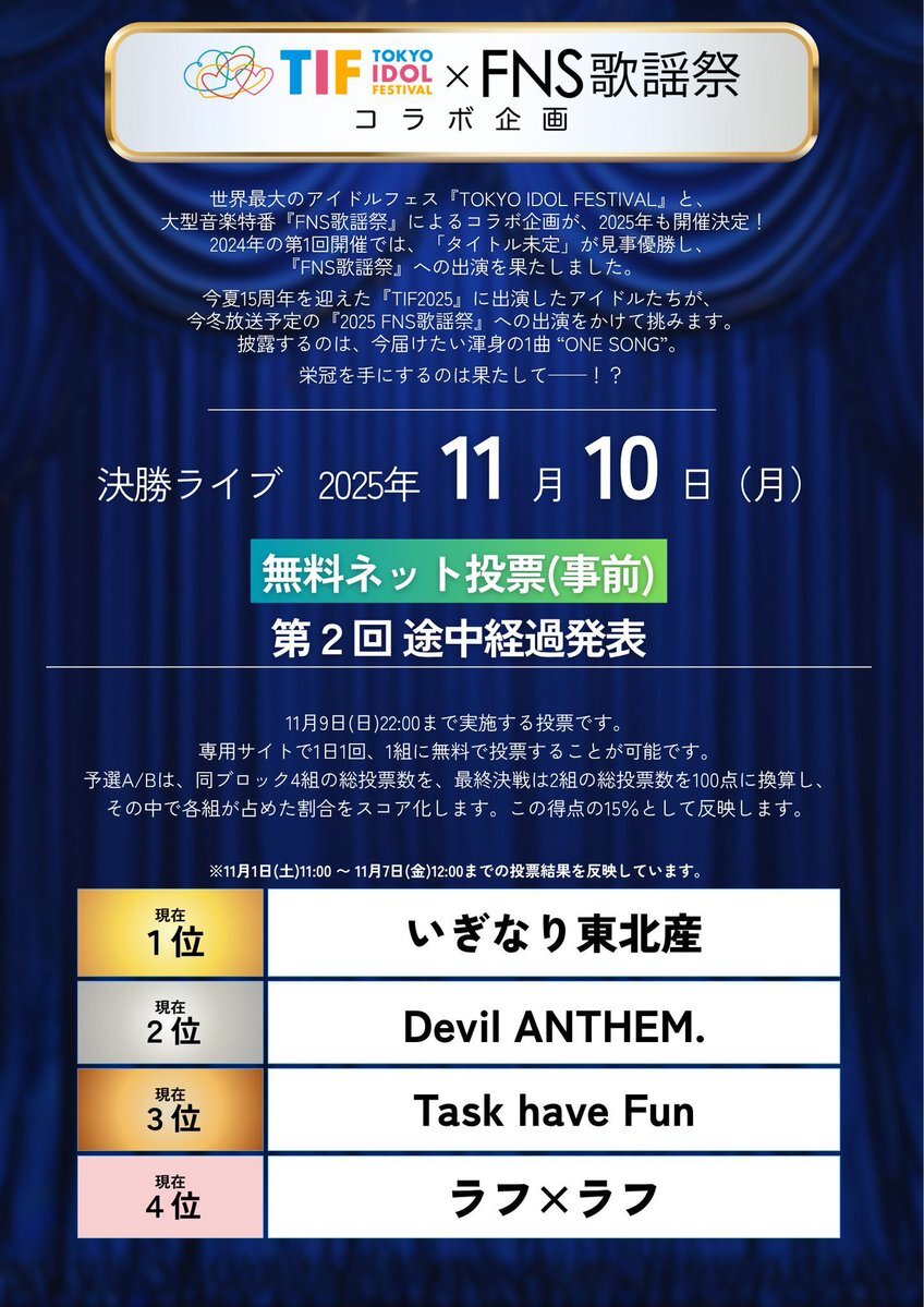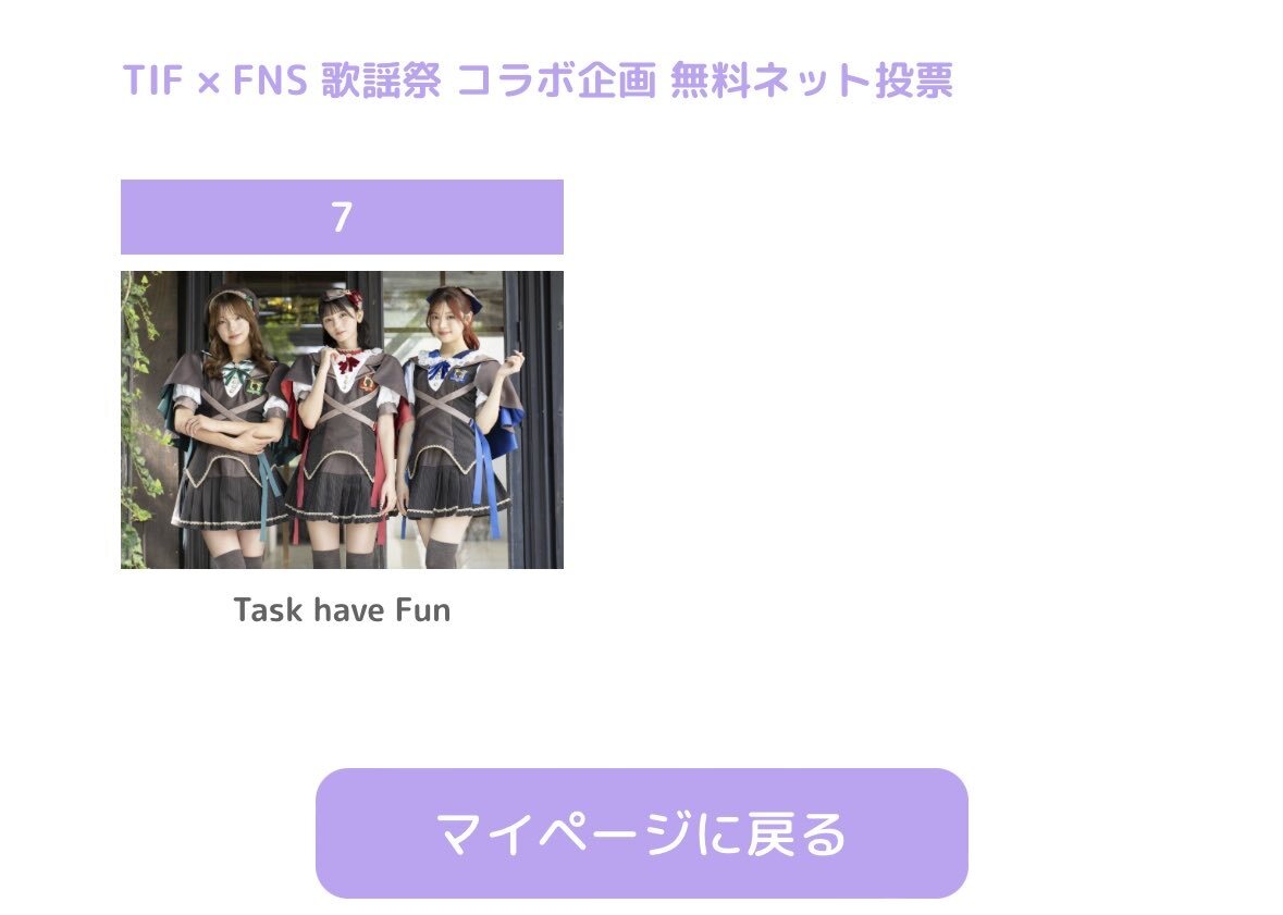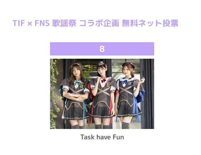Task have Fun #FNS歌謡祭 出演をかけた TIFコラボ企画に参加中です🌟 🔥無料ネット投票受付期間中🔥 《1日1回、誰でも投票可能》 投票はこちらから ▶︎ official.idolfes.com/s/tifst/?ima=0… 第2回途中経過も全体3位でした。 毎日投票いただきありがとうございます🫶🏻 #TIF2025