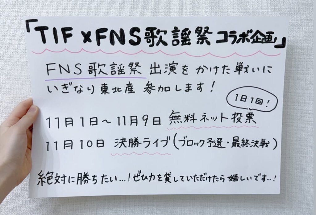 TIF×FNS歌謡祭コラボ企画開催中! いぎなり東北産に投票よろしくお願いします! @madeintohoku @TIP_TIF_staff #いぎなり東北産 #FNS歌謡祭 #雑コラ pic.x.com/M6eUQCQ6bc