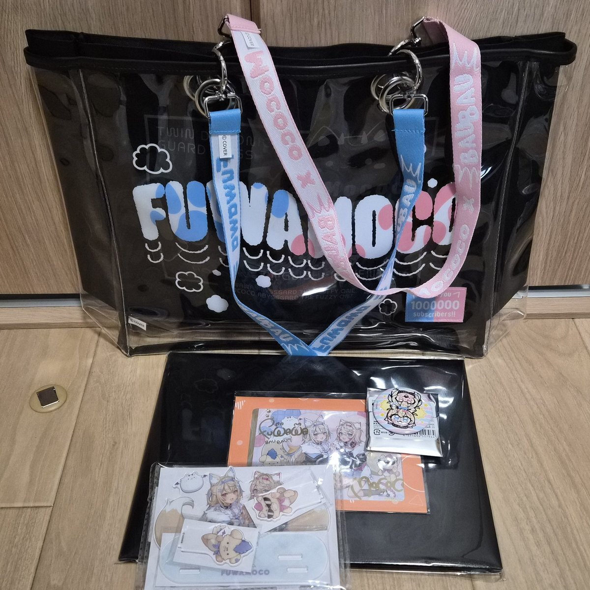 FUWAMOCOの100万人記念グッズ来たぁ!人生初の数量限定買って良かった。 めっちゃ可愛いしバッグは普通に使い勝手良さそう。 さてどう飾るかなぁ••• #FUWAMOCO pic.x.com/VUENKz0Acm