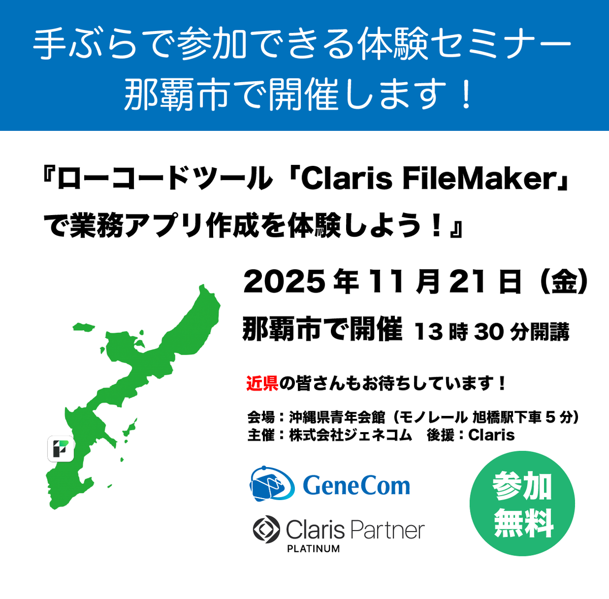 11月21日(金)沖縄県那覇市にて、『ローコードツール Claris #FileMaker で業務アプリ作成を体験しよう!』を開催します(参加無料)。 約3時間で業務アプリを作成できる体験型のセミナーです。 皆様のご参加をお待ちしています。 実習後には個別相談もOKです! #ファイルメーカー #Claris pic.x.com/JpqdCxTe9H