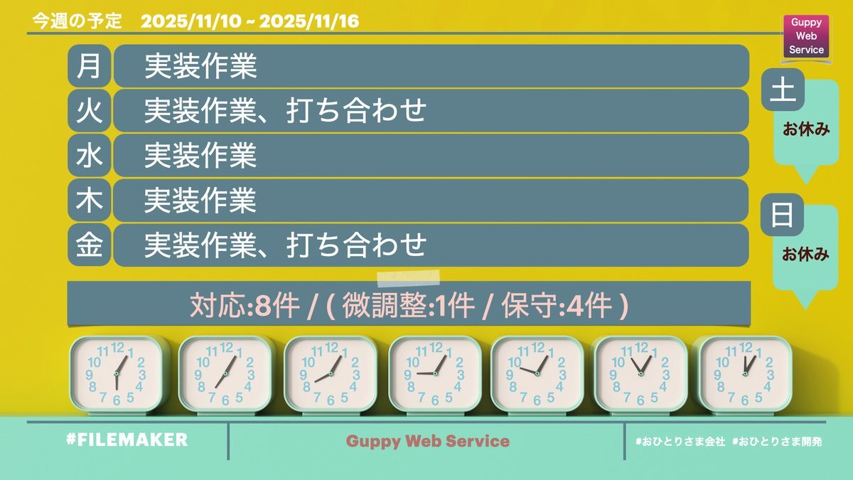 おはようございます。 週明けは家族の通院などが重なり、週中での今週の予定です。 あっという間に週後半へ! GWSはおおよそ 10時〜13時、15時〜18時 の稼働です。 #今週の予定 #FileMaker #おひとりさま開発 #おひとりさま会社 pic.x.com/fk1o4HV55E