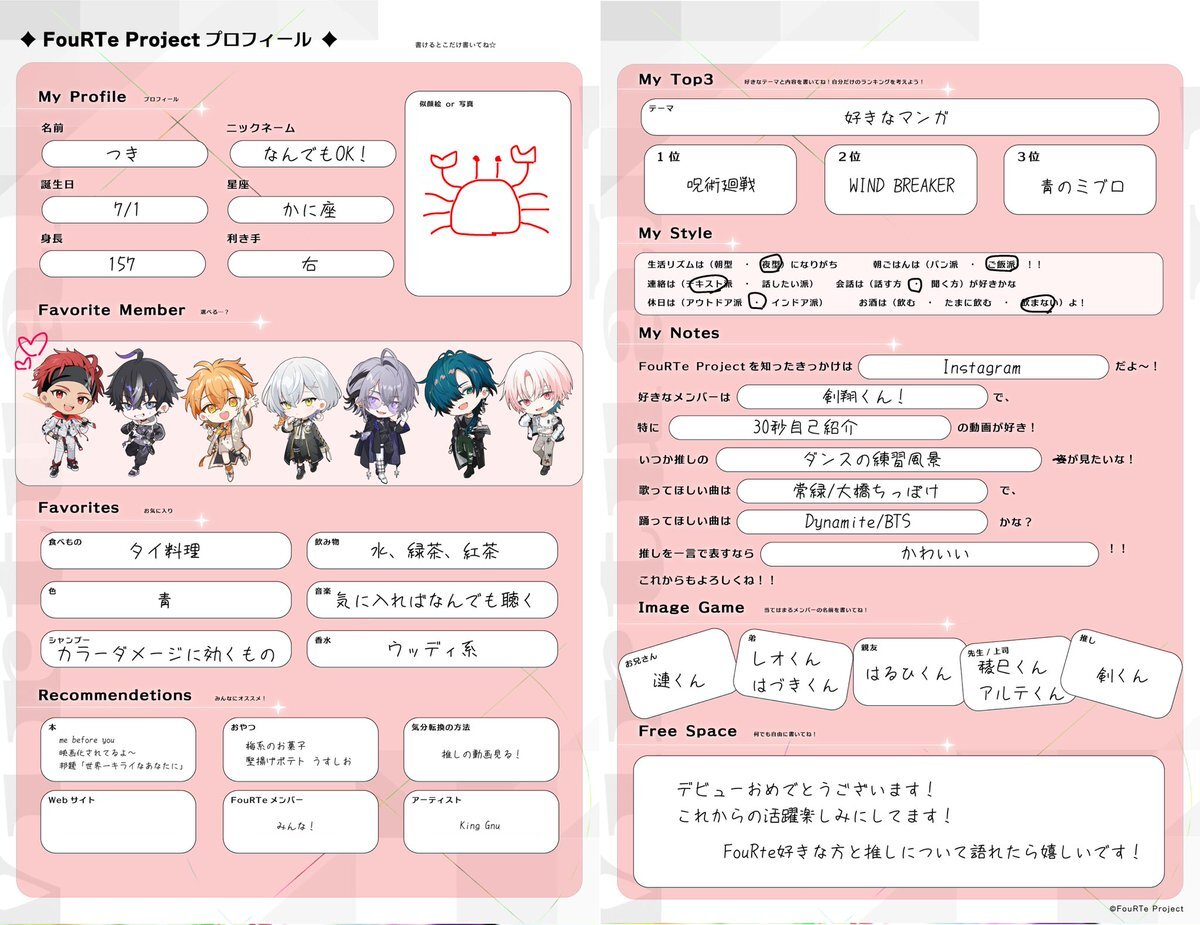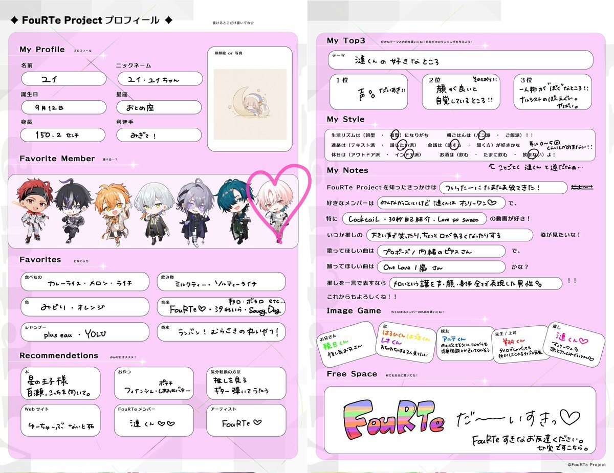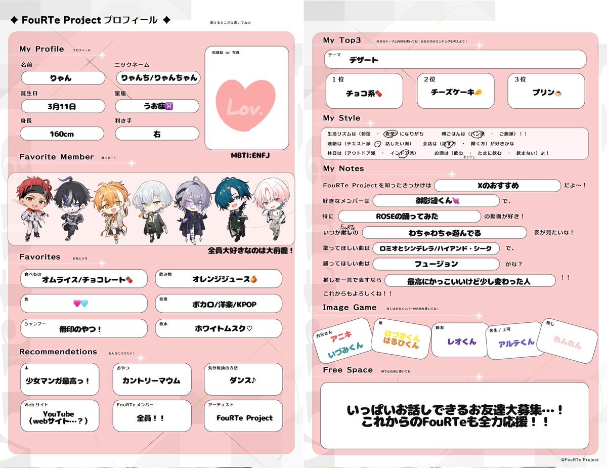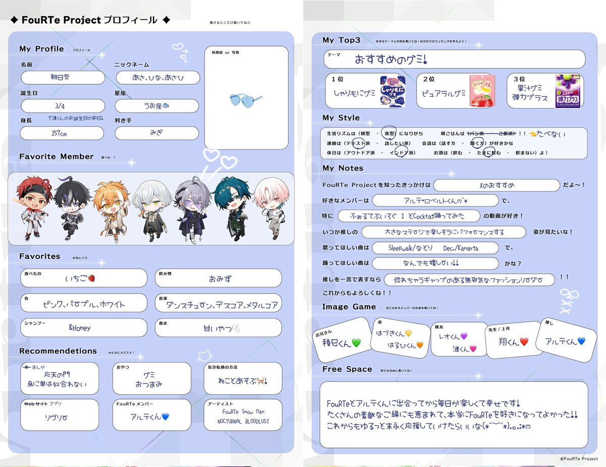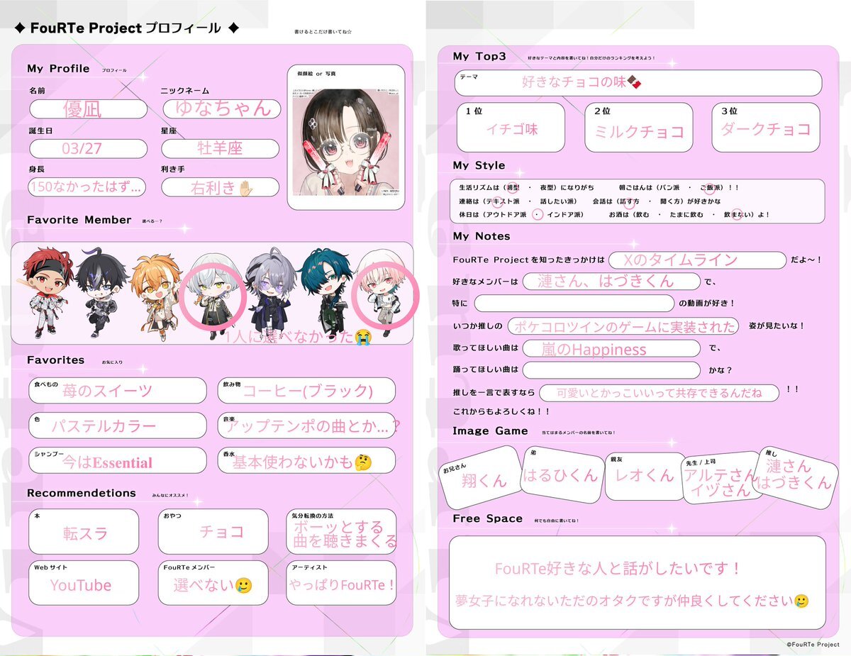 公式さまのプロフ帳おかりしました❕ プロフ帳書くの久々で楽しかった♡ ̖́- .*・゚ lit.link/xxreo0 .゚・*. #FouRTeデビュー #FouRTe好きな人と繋がりたい #FouRte好きさんと繋がりたい pic.x.com/4QWsDKt8St