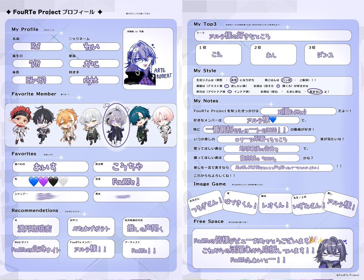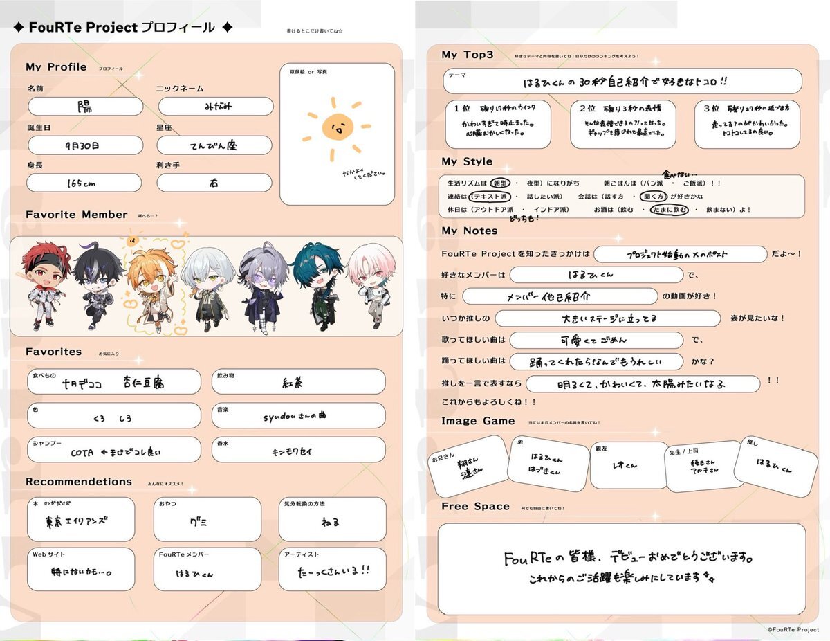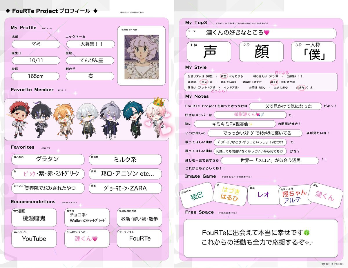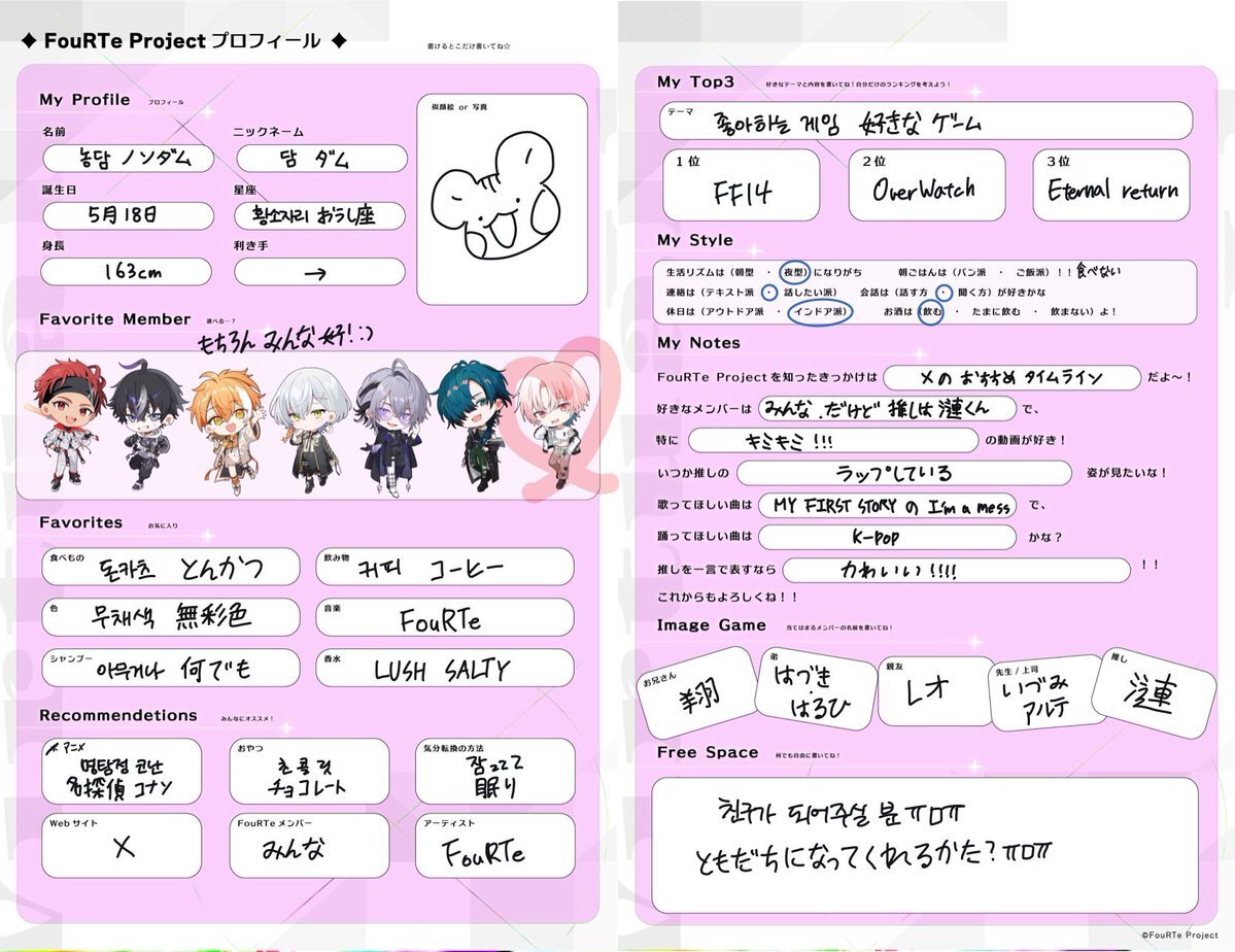 公式さまのプロフ帳おかりしました❕ プロフ帳書くの久々で楽しかった♡ ̖́- .*・゚ lit.link/xxreo0 .゚・*. #FouRTeデビュー #FouRTe好きな人と繋がりたい #FouRte好きさんと繋がりたい pic.x.com/4QWsDKt8St