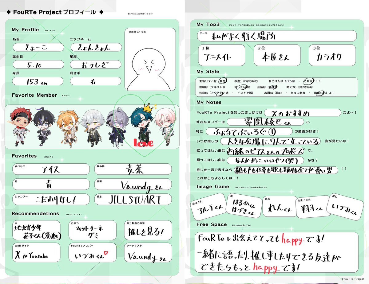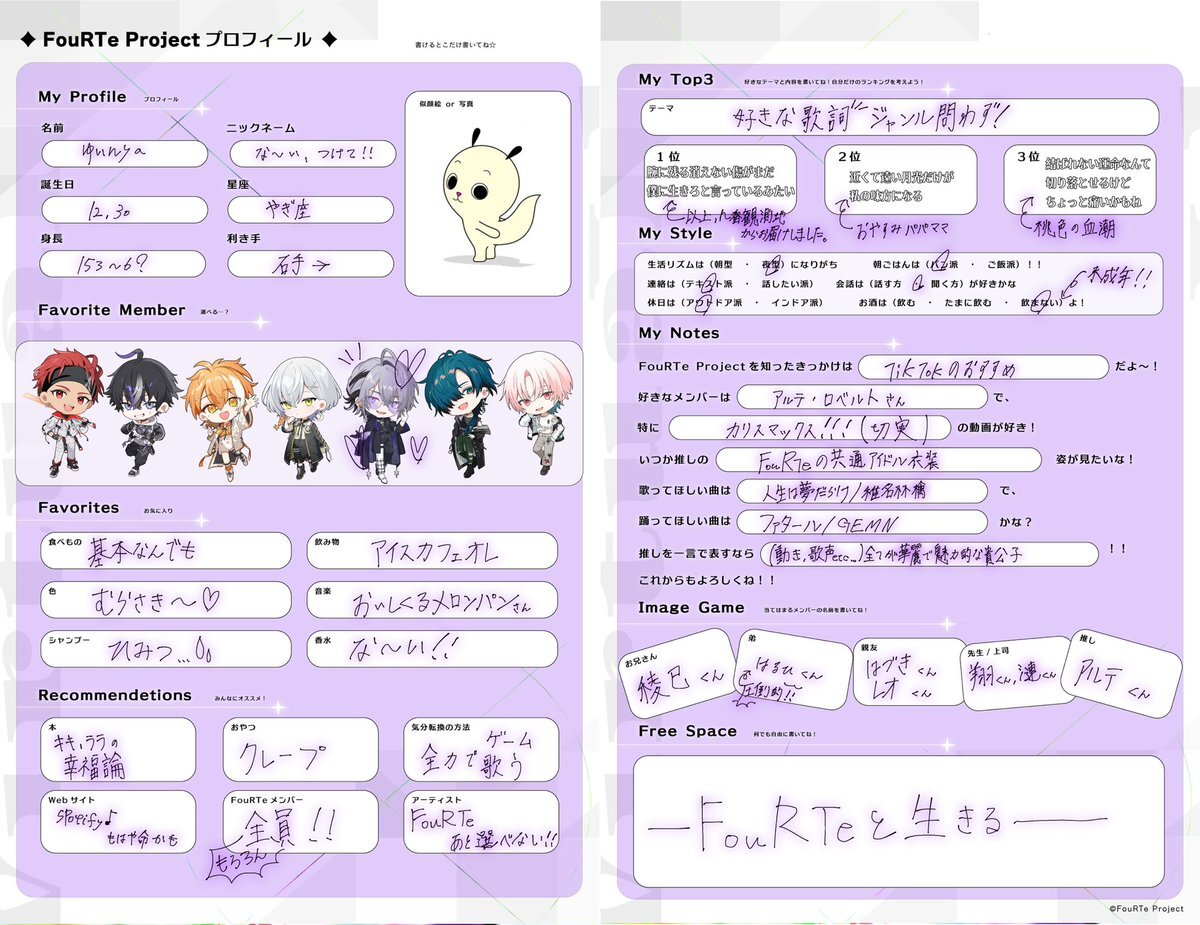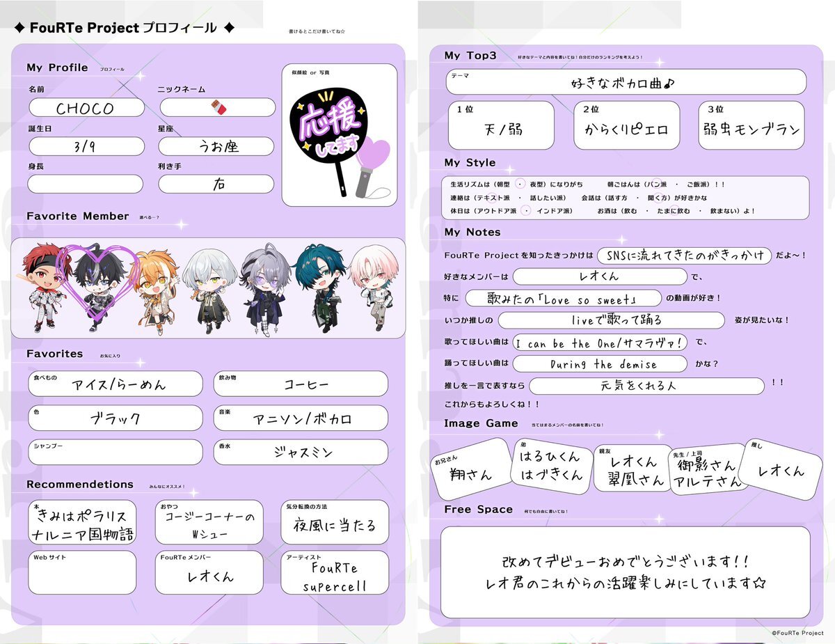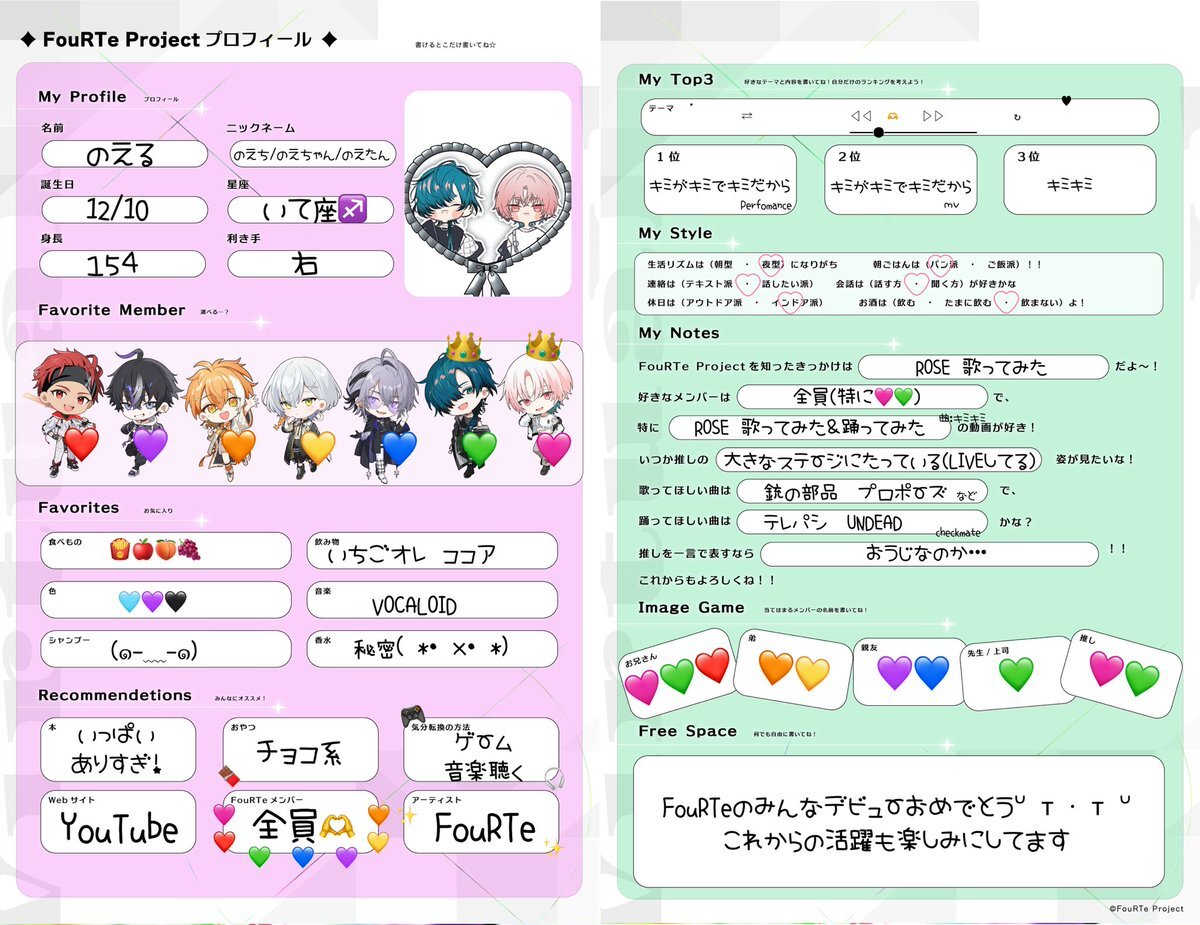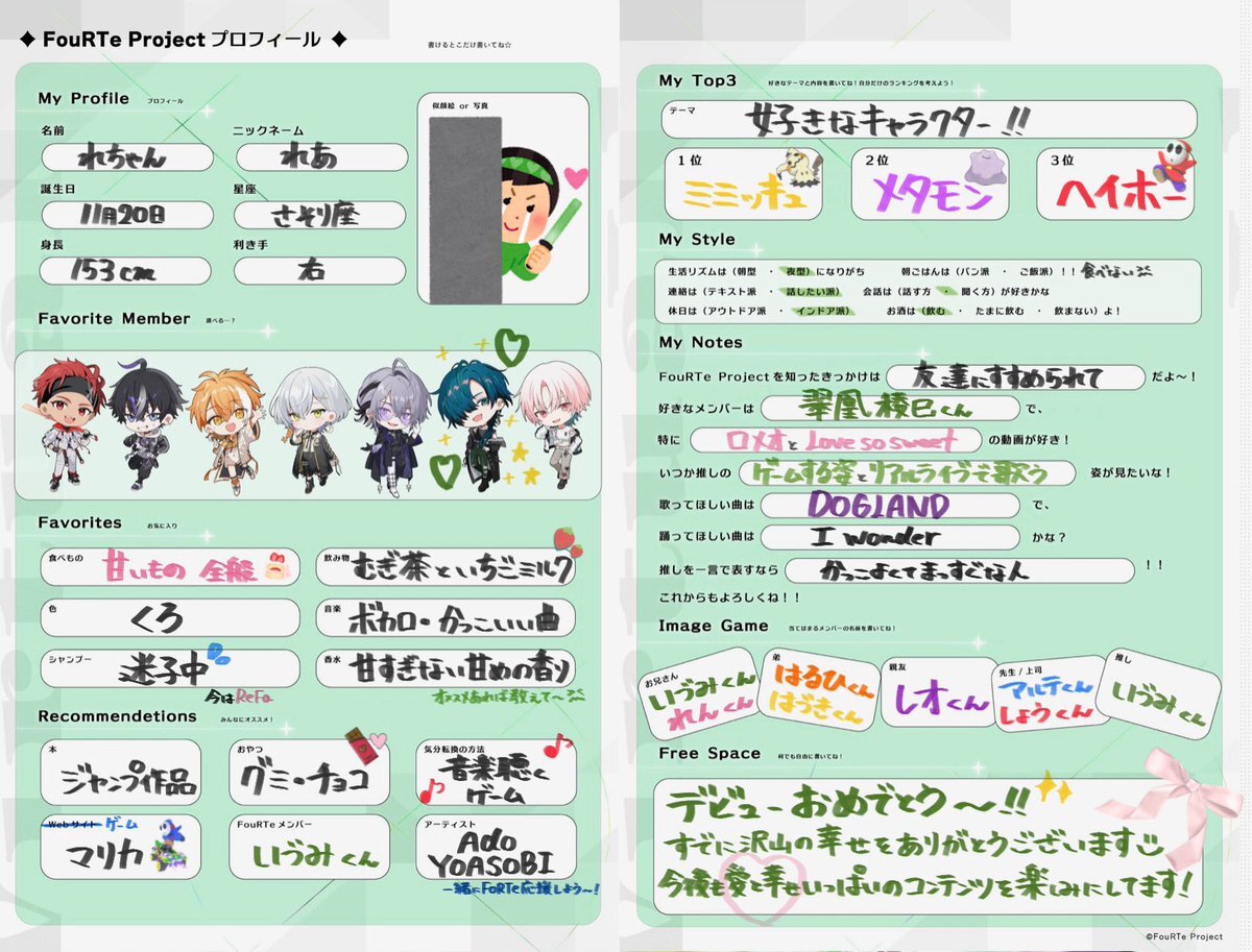 公式さまのプロフ帳おかりしました❕ プロフ帳書くの久々で楽しかった♡ ̖́- .*・゚ lit.link/xxreo0 .゚・*. #FouRTeデビュー #FouRTe好きな人と繋がりたい #FouRte好きさんと繋がりたい pic.x.com/4QWsDKt8St