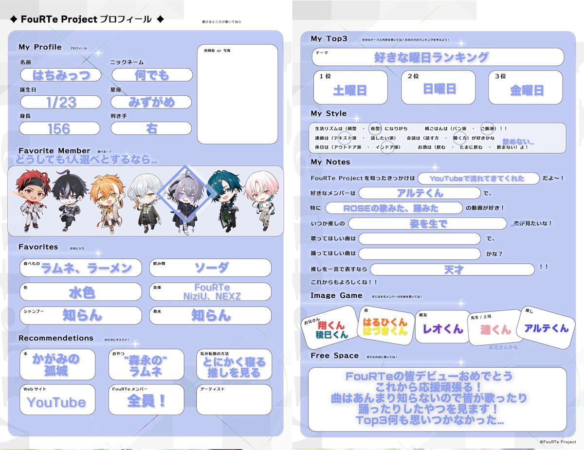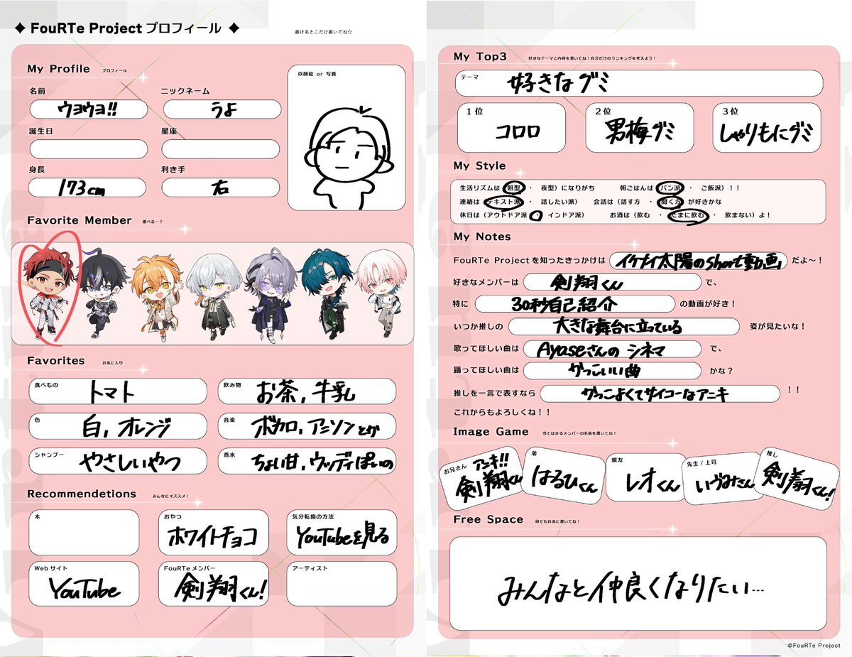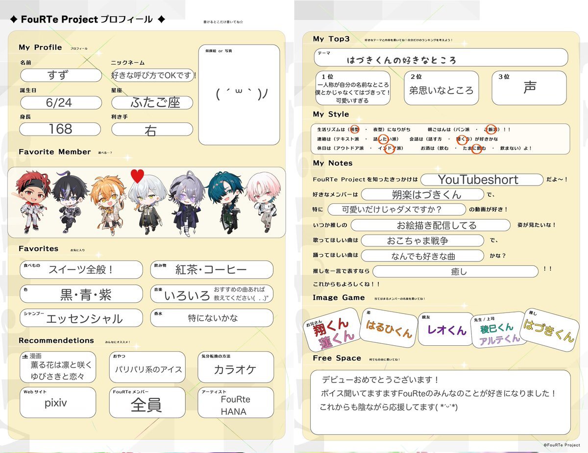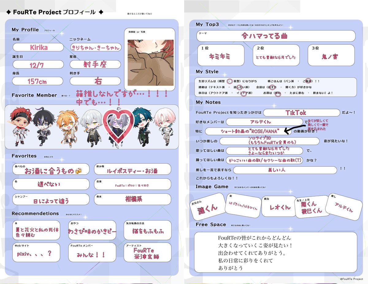 プロフィール完成 ✌︎ˊ꒳ˋ✌︎  元ツイで反応してください💕 (間違っているところを直しました💦) #FouRTe #FouRTe好きな人と繋がりたい #FouRte好きさんと繋がりたい pic.x.com/wHkQ97NCk6