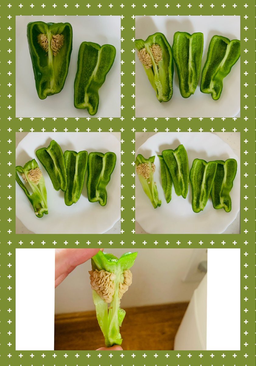 ピーマン🫑を切る時ってどんな風に切ってますか?私はこの方法を知ってから絶対この切り方なんだけど、まな板にピーマン🫑を立てて、一面ずつ剥がすような感じで包丁🔪を入れると綺麗に面が取れて、ヘタとお尻の部分、中の筋と種だけが取り除ける👇ピーマンの種が散らなくて格段に楽✨ #GLAY野菜部 pic.x.com/nPtLFgDrMP