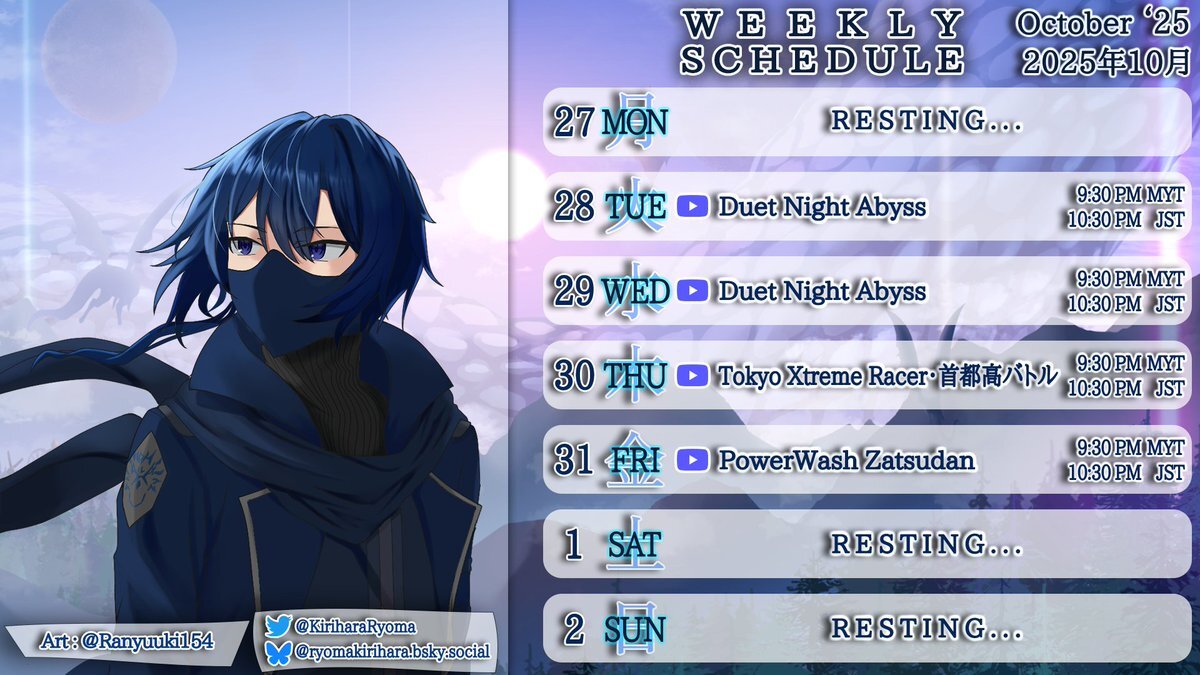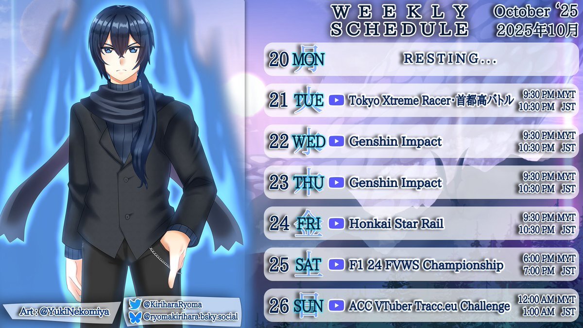 【Schedule: 20th - 26th October 25】 10月20日 - 10月26日 🎦Live •︎ #KiriRyoLive 🎨Art •︎ #Kiriharart 🎬Clip •︎ #KiriCord 🎭Memes •︎ #Kiriwara 🎶Song •︎ #Kiriuta 💙Fan Name •︎ #RyuuTomo 🔞NSFW •︎ #Kirilewd #VTubersMY #MYVT #Konkiriwa #StarMyriadMY #StarMY