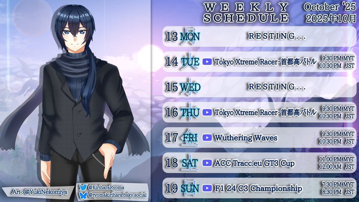 【Schedule: 13th - 19th October 25】 10月13日 - 10月19日 🎦Live •︎ #KiriRyoLive 🎨Art •︎ #Kiriharart 🎬Clip •︎ #KiriCord 🎭Memes •︎ #Kiriwara 🎶Song •︎ #Kiriuta 💙Fan Name •︎ #RyuuTomo 🔞NSFW •︎ #Kirilewd #VTubersMY #MYVT #Konkiriwa #StarMyriadMY #StarMY