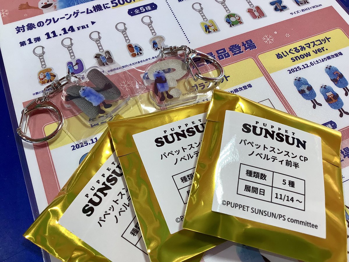 ✨#パペットスンスン×#GiGO✨ ☃️プライズキャンペーン~2025 WINTER~☃️ ・ブランケット ・缶ミラー 稼働しました〜! 対象機に500円投入で 『オリジナルローマ字アクキー(全5種)』を ランダムで1個プレゼント🎁 #GiGOのお店 限定のスンスン景品✨ ぜひGETしちゃって下さいませ! #GiGO帯広稲田