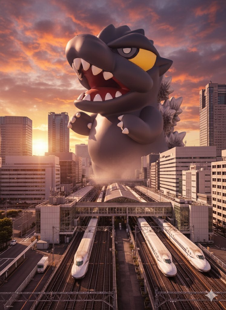 【NEW画像】グーグルAIを利用して作成(作製) 『デフォルメGODZILLA・ゴジラ』 天に向かって咆哮🦖✨④場所→JR(東海&西日本)新幹線🚄「新大阪」駅周辺※天候→夕方🌆 #NEW画像 #デフォルメゴジラ #Godzilla pic.x.com/UebPYZC9BW