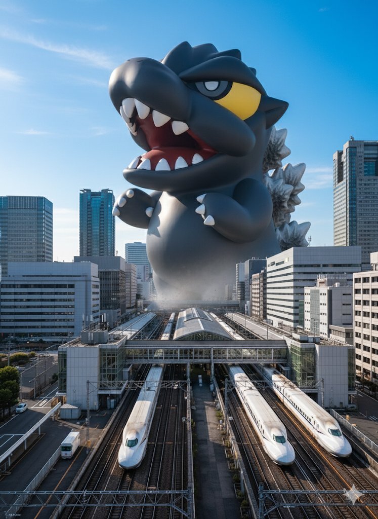 【NEW画像】グーグルAIを利用して作成(作製) 『デフォルメGODZILLA・ゴジラ』 天に向かって咆哮③ 場所→JR(東海&西日本)新幹線🚄「新大阪」駅周辺🦖✨ ※天候→昼間🌤️ #NEW画像 #デフォルメゴジラ #Godzilla pic.x.com/joe5UwVfz4