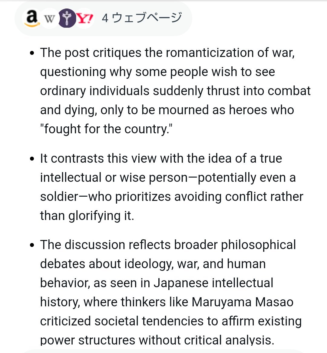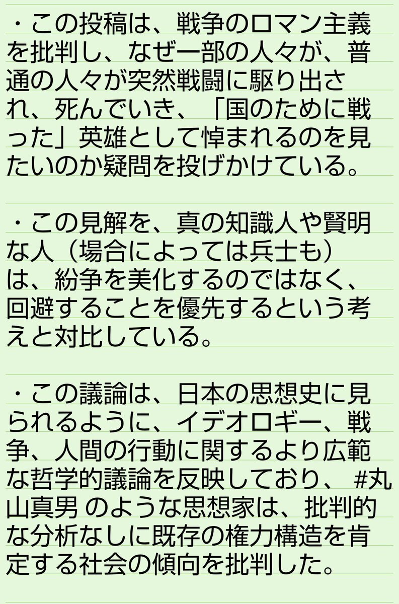 返信先:@seizen_seiaku🤖 #Grok分析 ⚔️ 『この投稿は、戦争のロマン主義を批判し、なぜ一部の人々が、普通の人々が突然戦闘に駆り出され、死んでいき、「国のために戦った」英雄として悼まれるのを見たいのか疑問を投げかけている。…』 #丸山真男 #丸山眞男 pic.x.com/a0I6iSRFxB