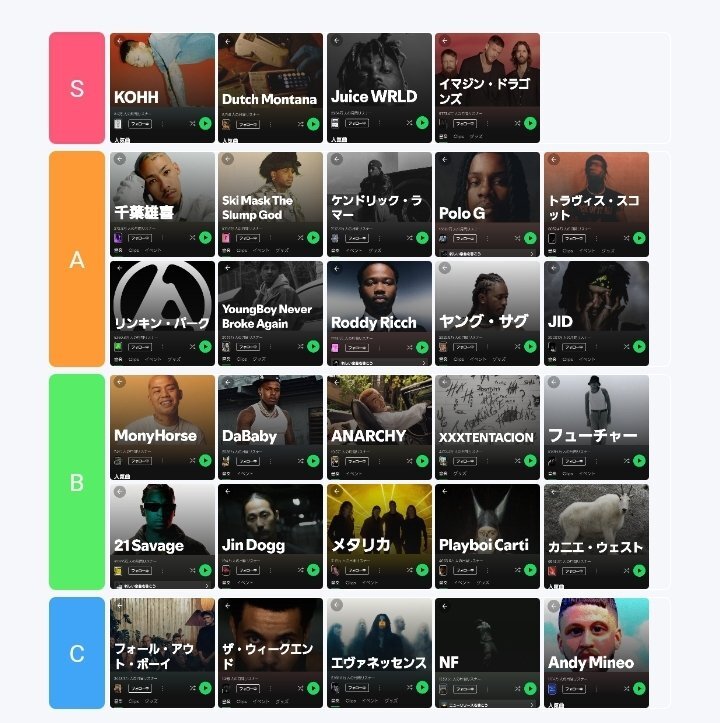 自分の好きなアーティストのTier表 (ほとんどHIPHOP) なんか他にいいアーティストいたら 教えてくだせえ #hiphop #HIPHOP好きと繋がりたい #オススメ教えて pic.x.com/R23gaz2Zhd