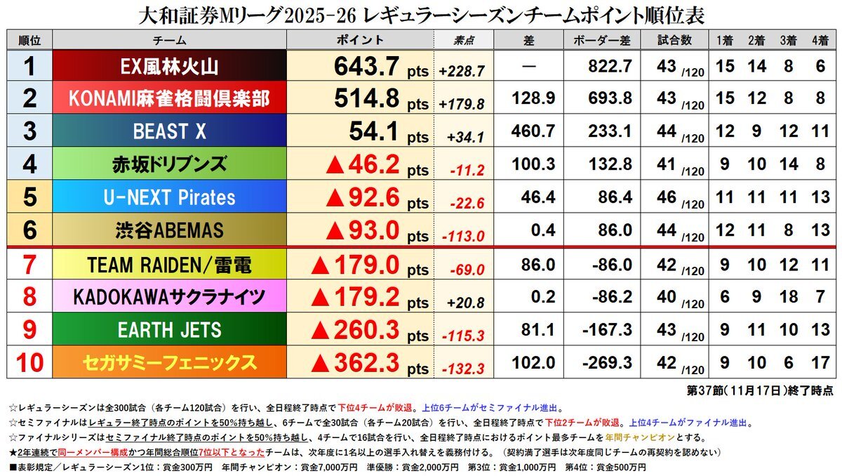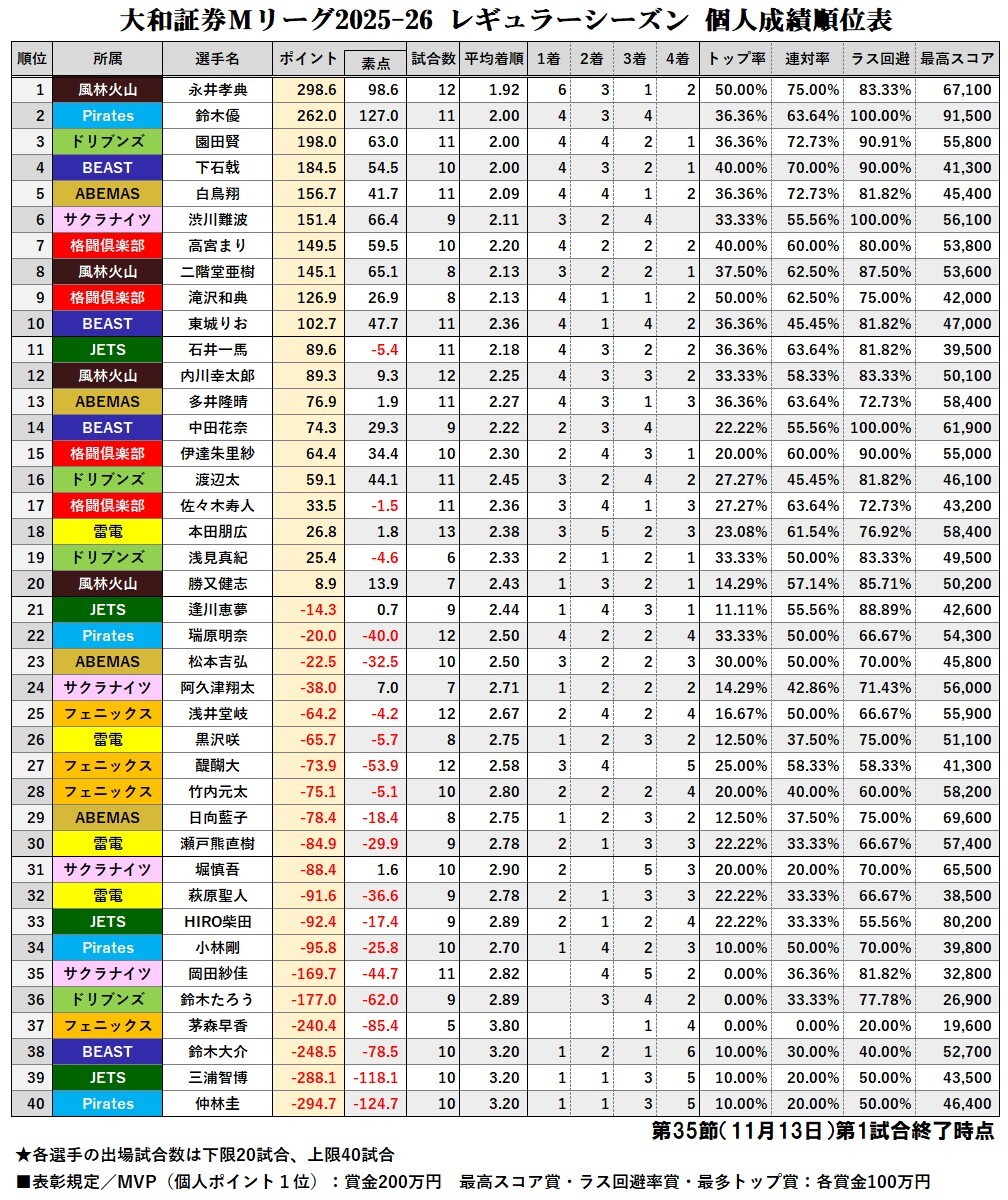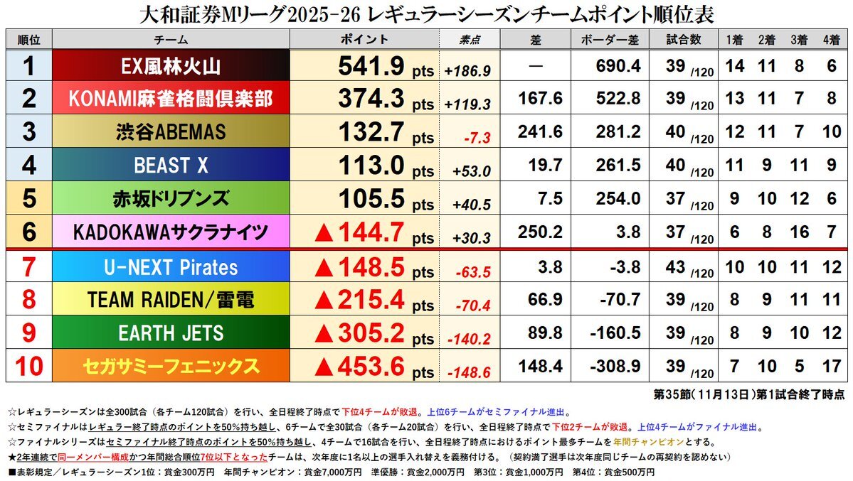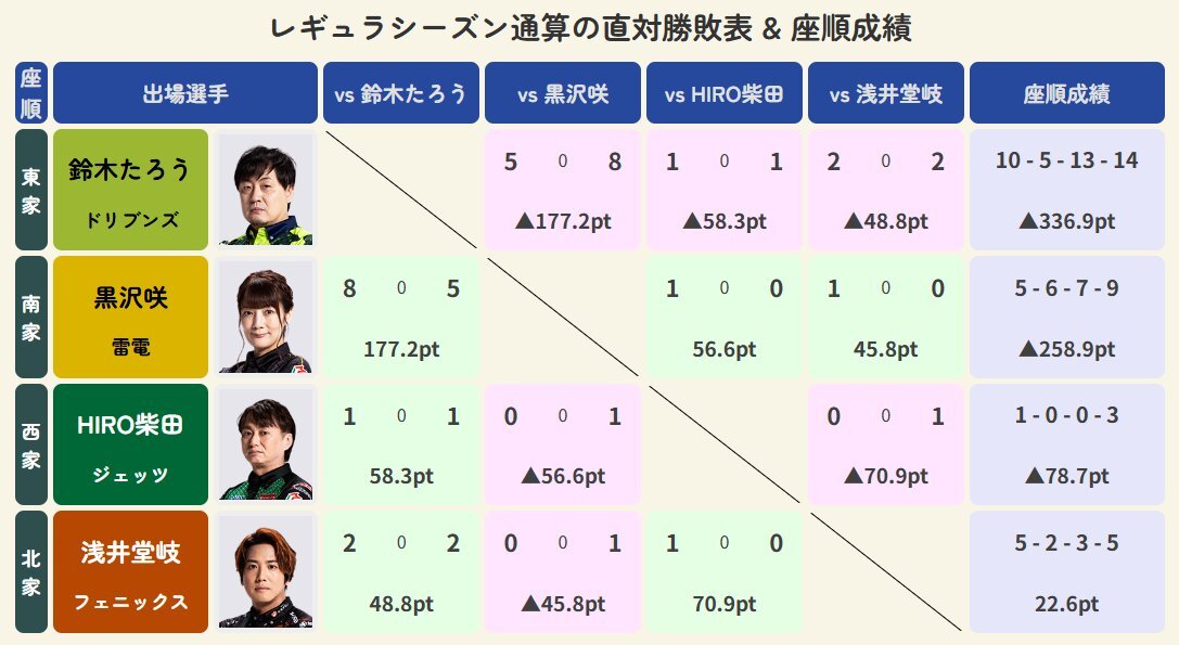 Мリーグ2025-26 レギュラーシーズン 11/13(木) 第2試合 レギュラーシーズン通算直対成績・座順成績 #Мリーグ #鈴木たろう #黒沢咲 #HIRO柴田 #浅井堂岐 pic.x.com/ipRZsqGjqA x.com/m_league_/stat…