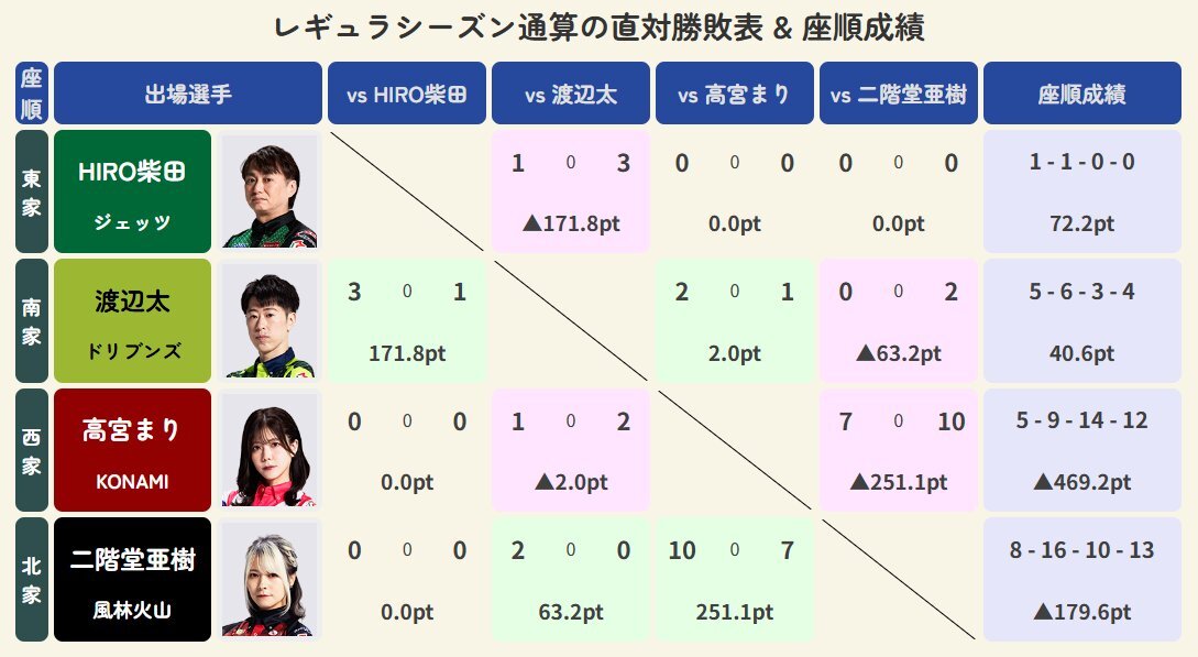 Мリーグ2025-26 レギュラーシーズン 11/18(火) 第2試合 レギュラーシーズン通算直対成績・座順成績 #Мリーグ #HIRO柴田 #渡辺太 #高宮まり #二階堂亜樹 pic.x.com/prVEWQTTBE x.com/m_league_/stat…