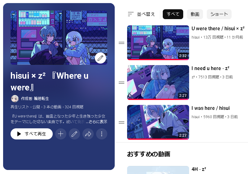 YouTubeの再生リスト 300回突破に感謝 !!!!!!! 『U were there / hisui × z²』は、幽霊となった少年と生き残った少女をテーマにした切ない楽曲🌃💙 『 I need u here - #z² 』と『I was here / #hisui 』は、それぞれの心の内を繊細に描き出し、情感豊かに心に響く楽曲 🔗youtube.com/playlist?list=… pic.x.com/OajKkVTOl2 x.com/z2_rinne_tense…