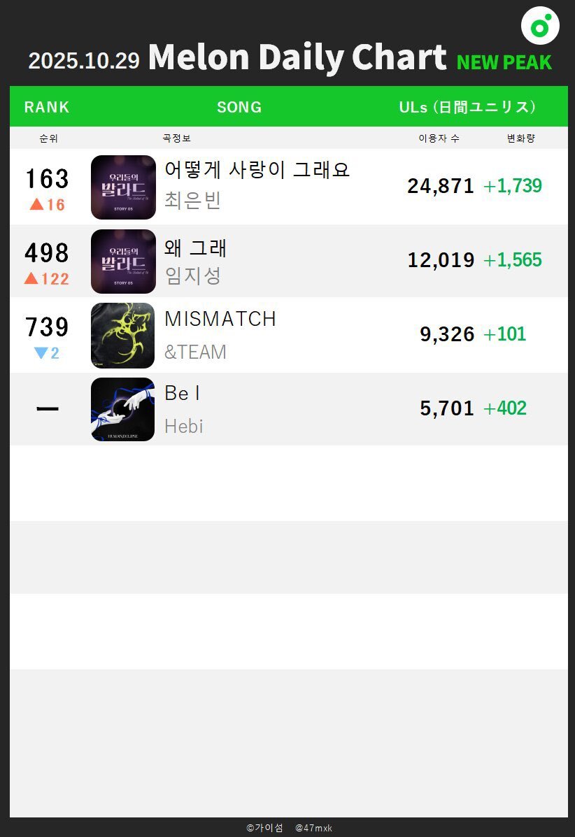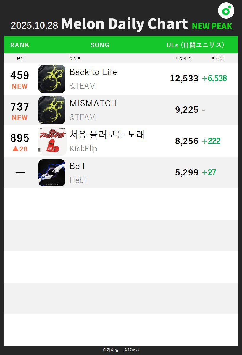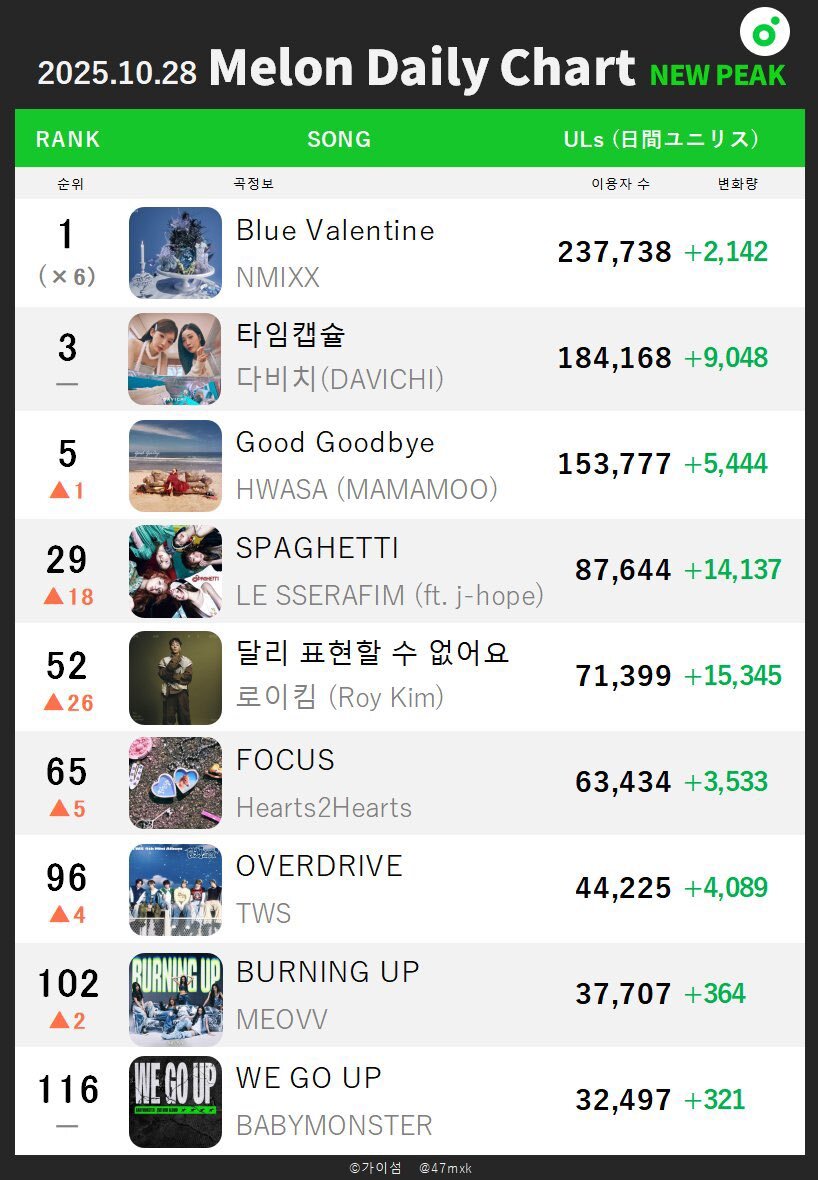 [📈251028 Melon日間ピークまとめ] #NMIXX #LE_SSERAFIM #Hearts2Hearts #TWS #MEOVV #KickFlip #DAVICHI #HWASA - Good Goodbye MAMAMOOファサ日間5位内進入開始!2020年「Maria」以来5年ぶりの達成。 #andTEAM - Back To Life &TEAMが日本の現地化グルとして初めて日間1000位圏内への進入に成功。 pic.x.com/3WIlNREPdK