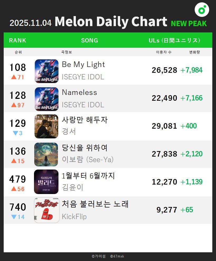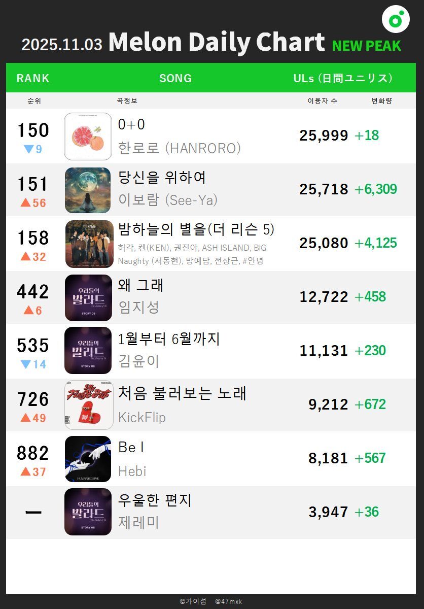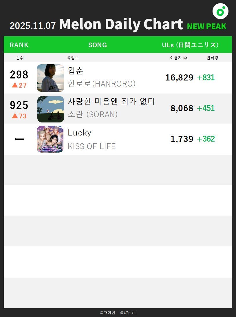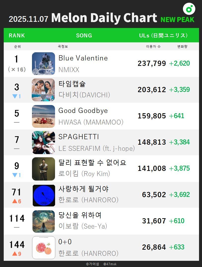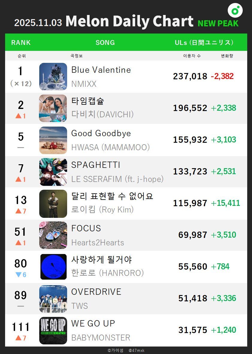 [📈251104 Melon日間ピークまとめ] #NMIXX #LE_SSERAFIM #Hearts2Hearts #TWS #KickFlip #HWASA #DAVICHI #Roykim - 달리 표현할 수 없어요 ロイキム最新曲が「내게 사랑이 뭐냐고 물어본다면」以来、丁度1年ぶりに日間10位内進入開始。 pic.x.com/qHJ9rt2Knz