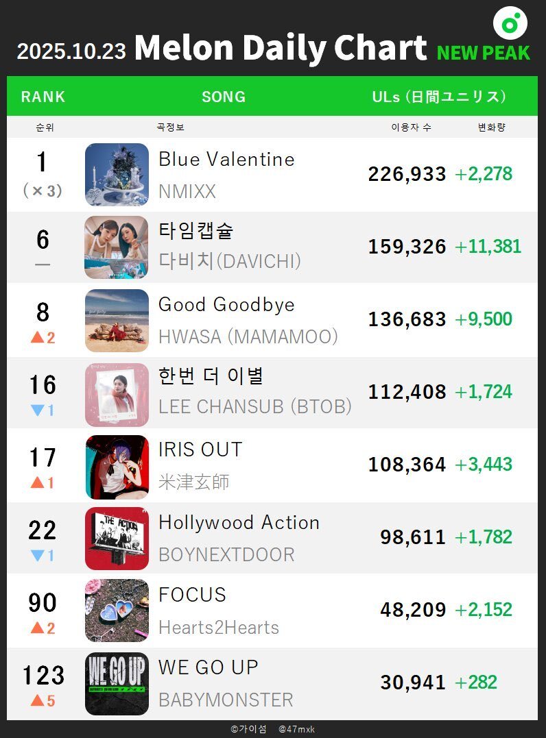 [📈251024 Melon日間ピークまとめ] #NMIXX #BOYNEXTDOOR #Hearts2Hearts #BABYMONSTER #DAVICHI #米津玄師 #HWASA - Good Goodbye MAMAMOOファサの最新曲が日間1桁台に進入開始!!日間8位以上を記録したのは5年前の大ヒット曲「Maria」まで遡ります。 pic.x.com/NUCkcnH7K4