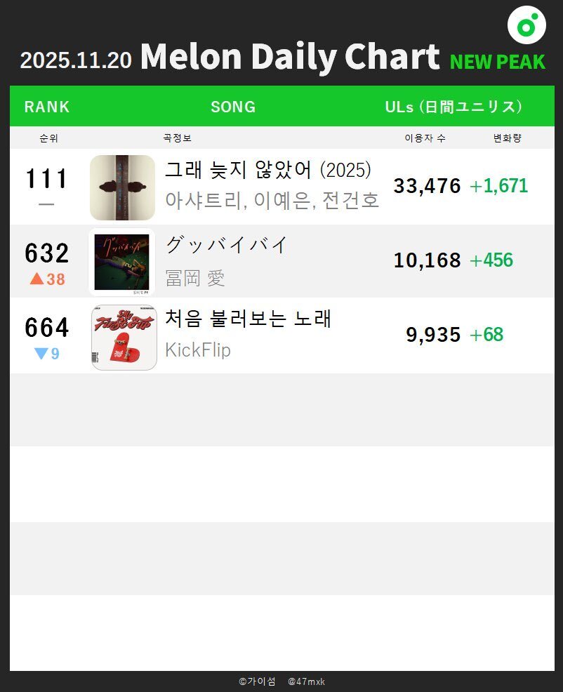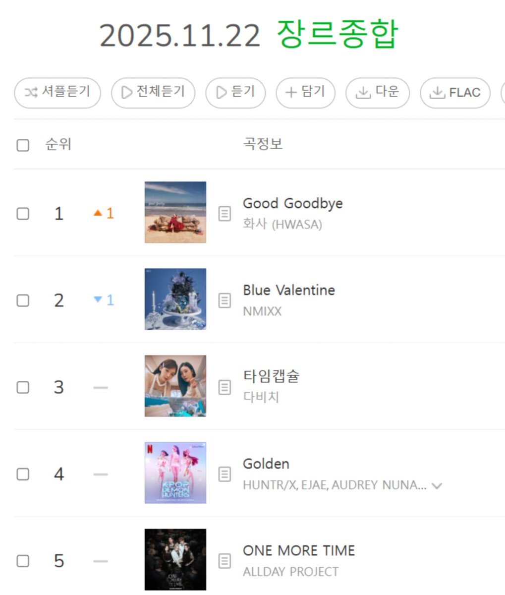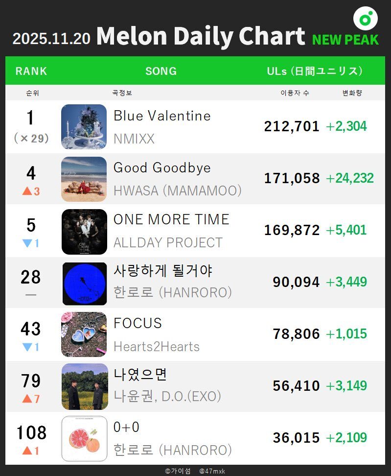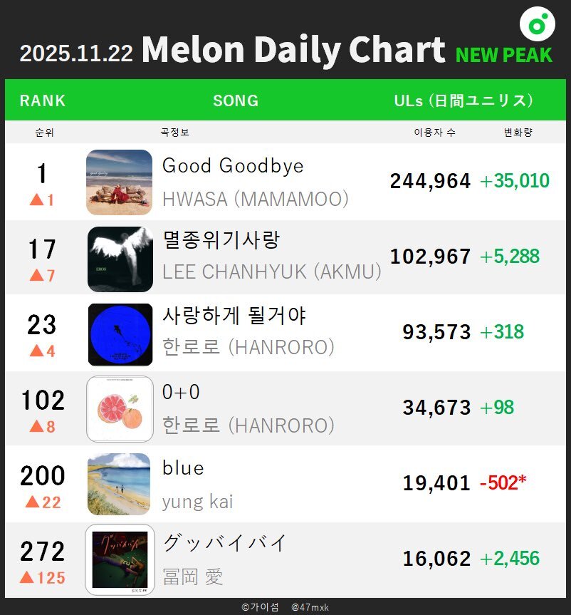 [📈251120 Melon日間ピークまとめ] #NMIXX #ALLDAYPROJECT #Hearts2Hearts #HANRORO #KickFlip #HWASA - Good Goodbye MAMAMOOファサの最新シングルが青龍映画賞でのパフォーマンスをきっかけにチャート急上昇!リリースから1ヶ月が経過しましたが、現在他の楽曲の2倍のペースでリスナー数が増加中。 pic.x.com/Uod8qFkzXi