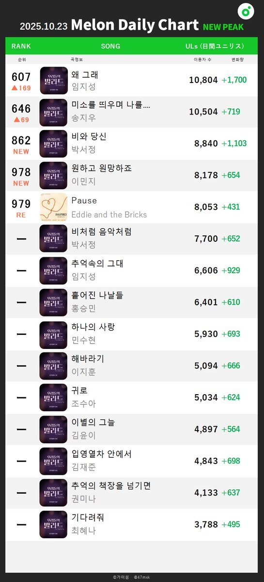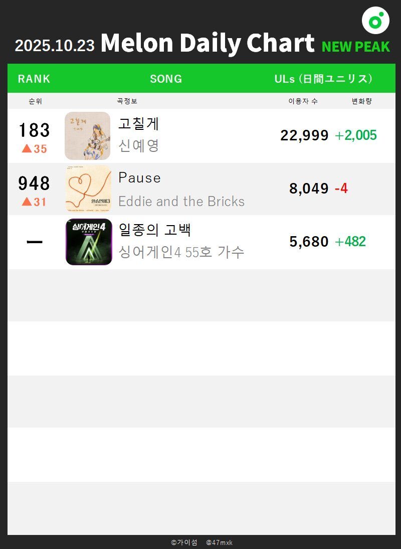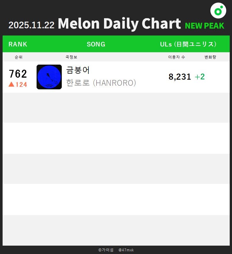 [📈251122 Melon日間ピークまとめ] #HWASA - Good Goodbye ファサ日間1位獲得!!IUを超えて2025年の女性ソロの楽曲として最高ユニリス数を記録。 #LEECHANHYUK - 멸종위기사랑 AKMUチャンヒョクが2022年のソロデビュー以来、ソロキャリアとして初めてULs10万を突破。 pic.x.com/mUKGFrot4c