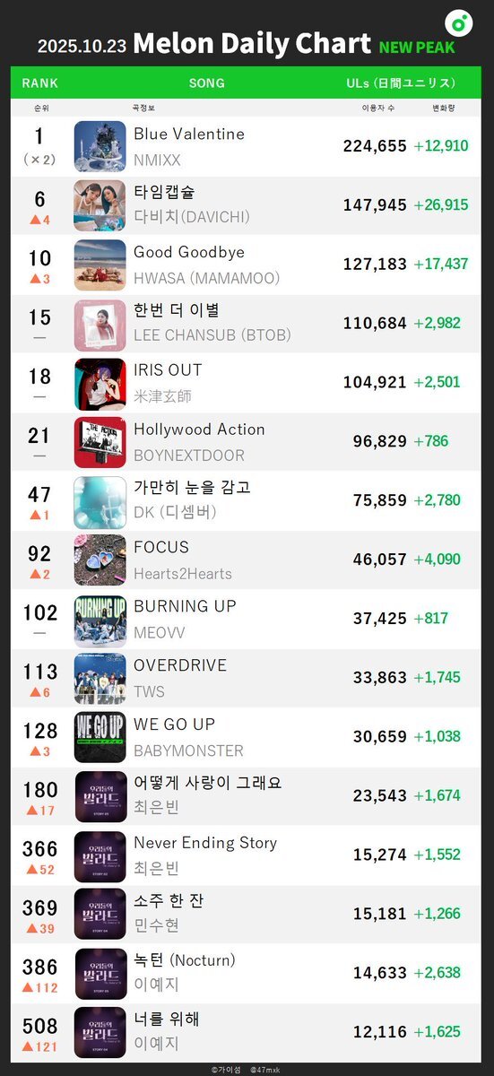 [📈251023 Melon日間ピークまとめ] #BOYNEXTDOOR #TWS #Hearts2Hearts #BABYMONSTER #MEOVV #NMIXX - Blue Valentine JYP女性グループが2日連続で日間1位を獲得したのはTWICE「Heart Shaker」以来、約8年ぶり。 #HWASA - Good Goodbye ファサ「I Love My Body」以来、2年ぶりに日間10位内進入開始。 pic.x.com/kFNLqMN5R6