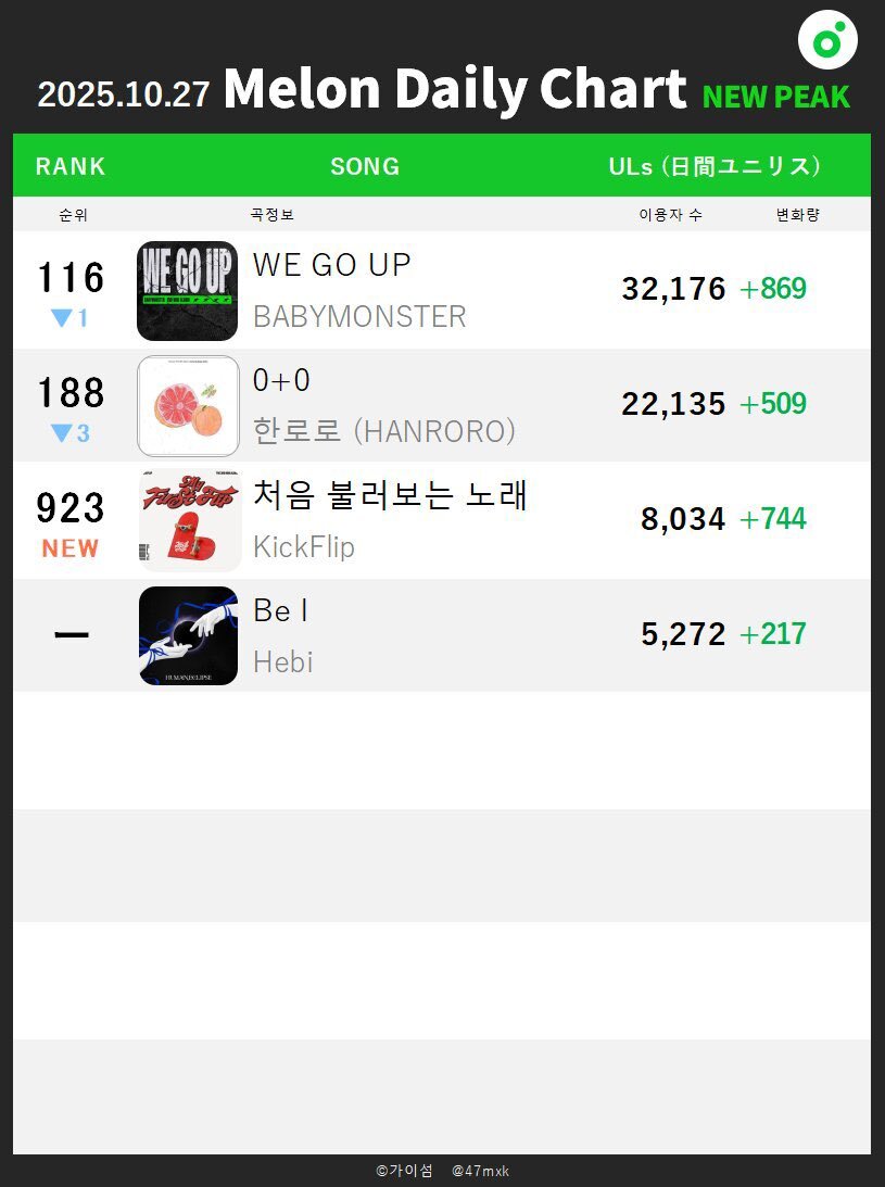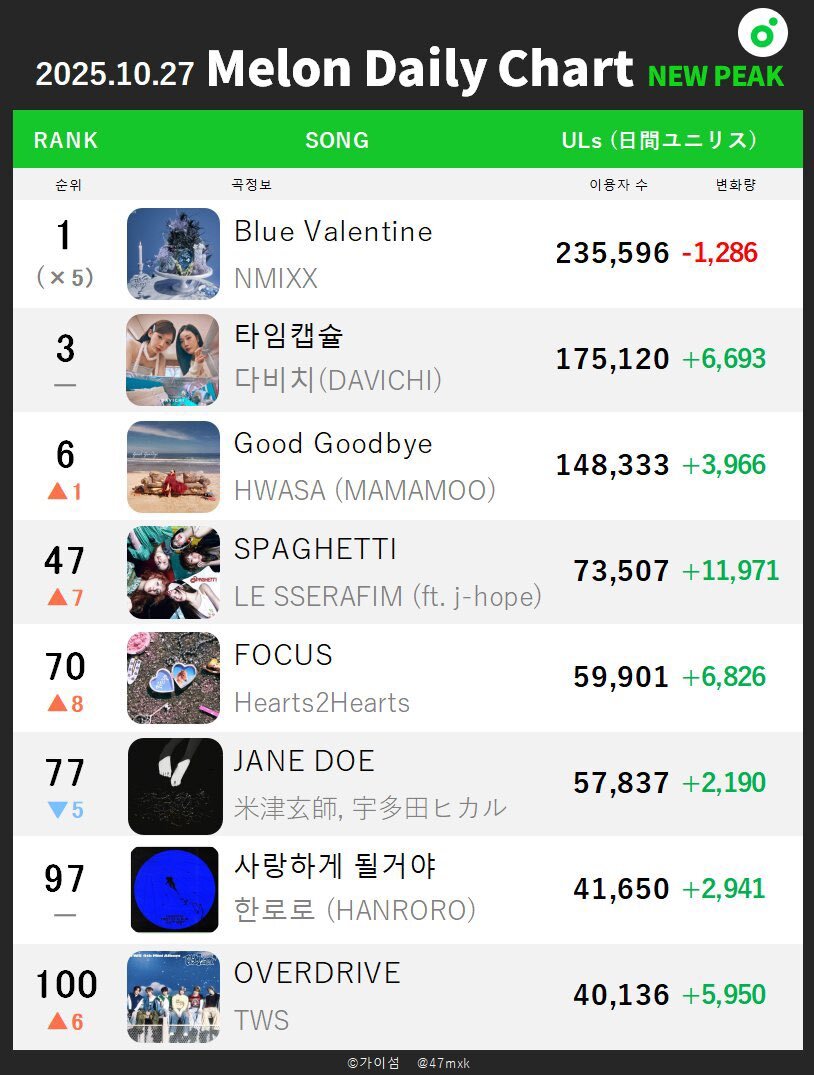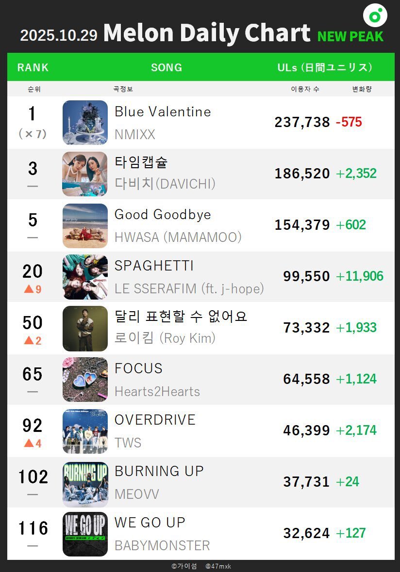 [📈251027 Melon日間ピークまとめ] #NMIXX #LE_SSERAFIM #Hearts2Hearts #BABYMONSTER #HWASA #DAVICHI #TWS - OVERDRIVE TWS自身4曲目となる日間100位内へ進入開始。 #KickFlip - 처음 불러보는 노래 日間1000位圏内に進入成功!デビュー曲「Mama Said」の949位を上回るグループ最高位を記録。 pic.x.com/eSlzkokqHS