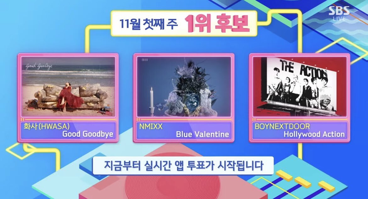 1ST PLACE NOMINEES for inkigayo #HWASA vs #NMIXX vs #BOYNEXTDOOR イソは #IVE ワールドツアーソウル公演のためお休み pic.x.com/EuWj1R5l59
