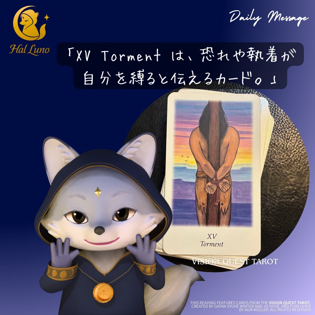 XV Torment(ライダー版/The Devil)は、恐れや執着が自分を縛ると伝えるカード。 やめたいのにやめられない習慣があるあなたへ。柱に縛られる状態が心地良くなっていませんか?その縄は緩められます。 #HalLunoの1枚 #狐の占い師 #今日のタロット #習慣 #心の解放 pic.x.com/M1QaBdyf5D