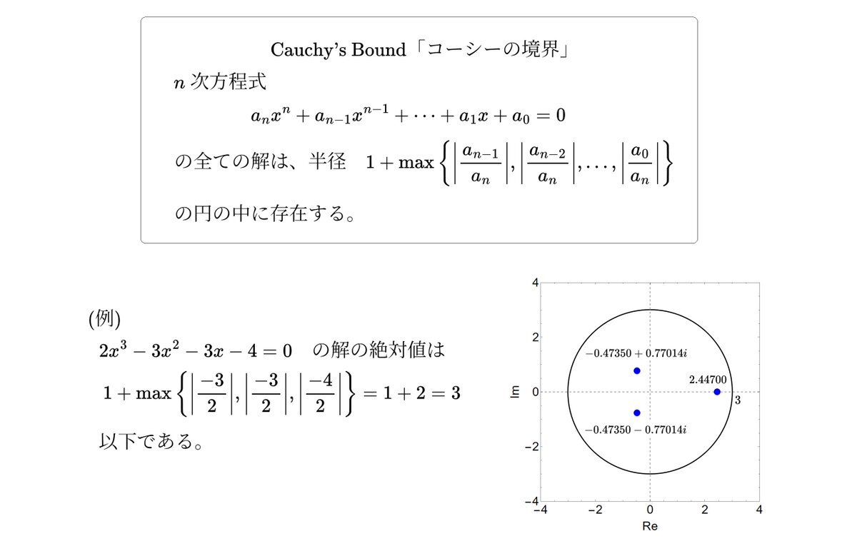 ~今日のトリビア~ n 次方程式の解について、その大きさ(絶対値)の上限を係数から簡便に与える方法が存在するので「解の絶対値は 3 未満だね」とか即答して驚かせることができる Cauchy’s Bound「コーシーの境界」
