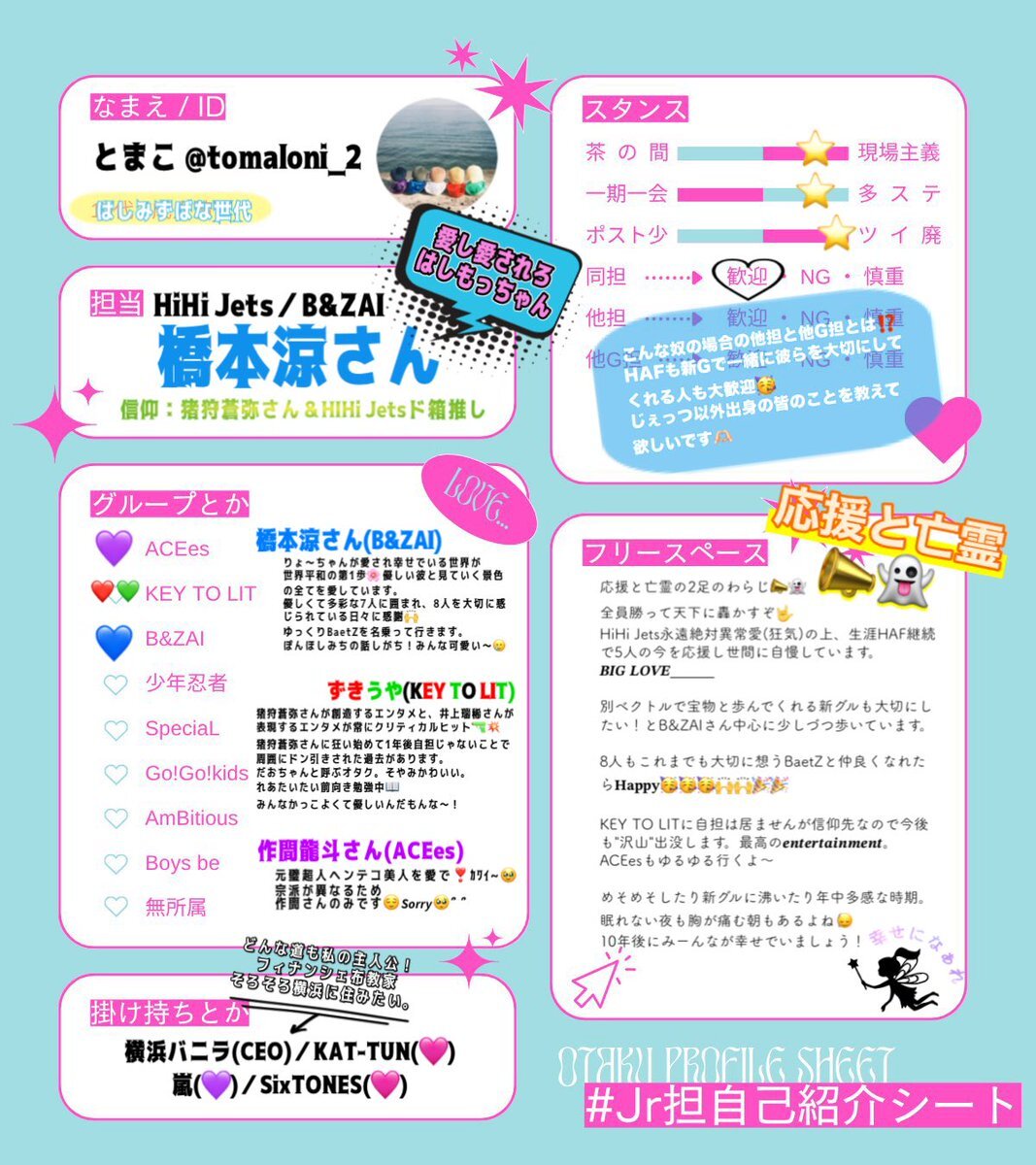 全ての現場を終え謎スタンスすぎるため 9割9分の人が回れ右する自己紹介シートが爆誕🎊💮 #FFのFFさんと繋がりたい #BandZAI担と繋がりたい #BaetZと繋がりたい #HiHiJets担と繋がりたい #HAFと繋がりたい #KEYTOLIT担と繋がりたい pic.x.com/EphBbyNzjU