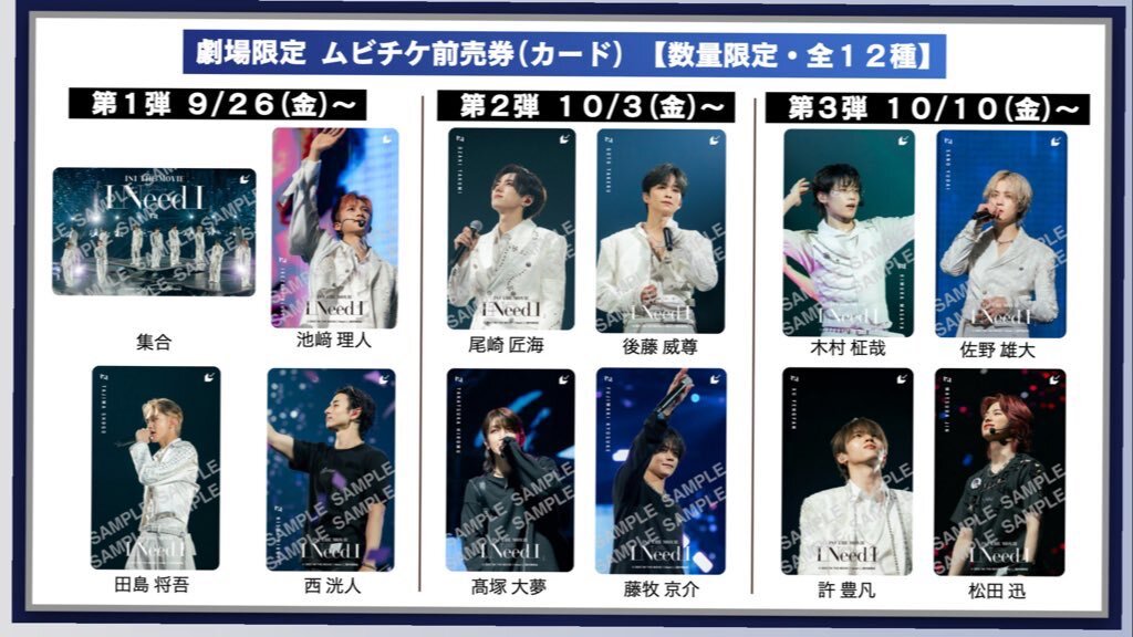 INI THE MOVIE I Need I ムビチケ 代行 [譲]第3弾 木村 佐野 許 松田 [求]定価+代行費0.02 開店前から並ぶ予定なので、第3弾は確実に購入できます。 第1弾、第2弾のメンバーも在庫があれば代行可能。近くの映画館は全て在庫有りでした。 dm.リプお待ちしております🌟 #INI代行 #I_Need_I