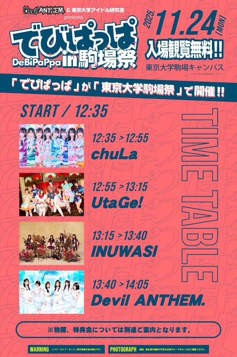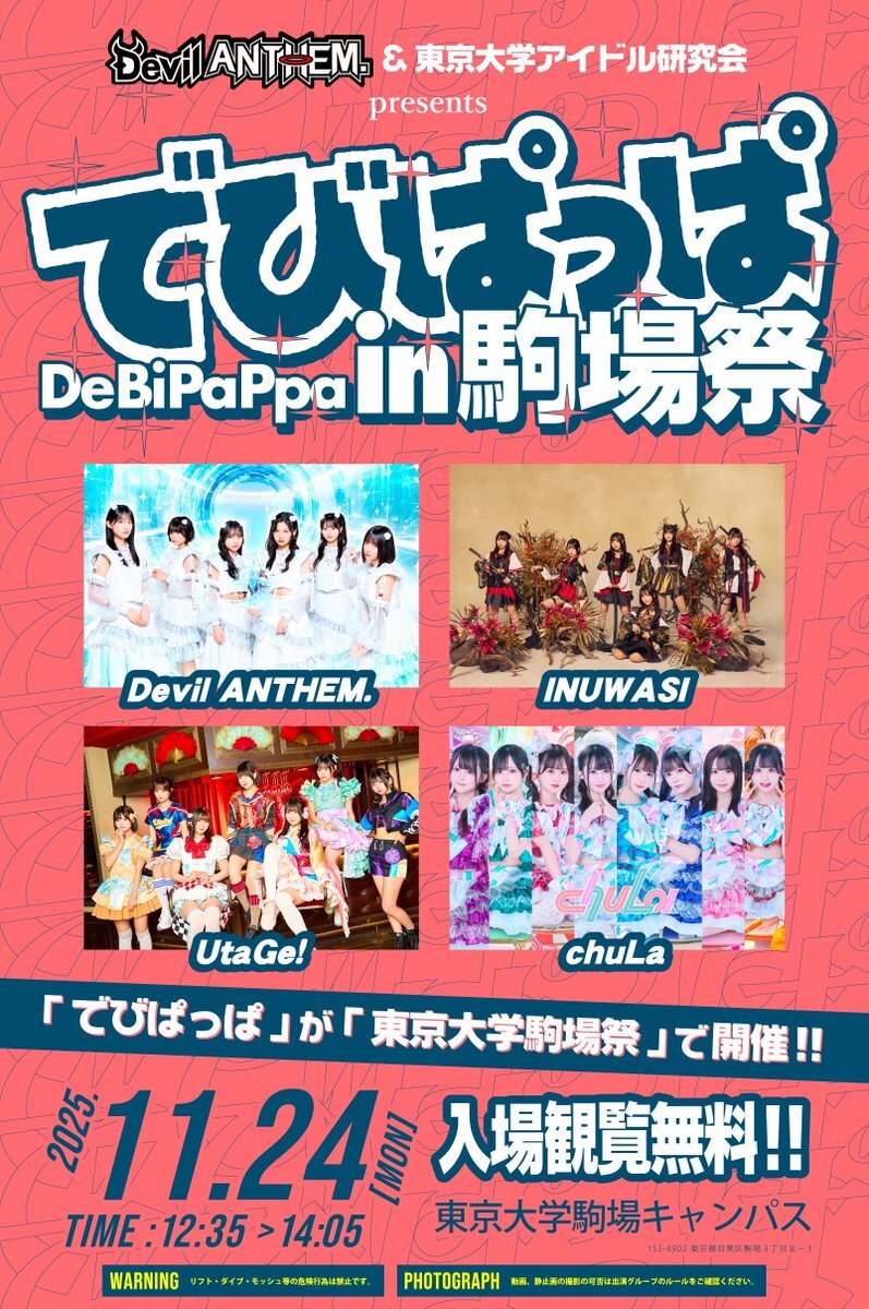 🐶🦅学祭ライブ決定 でびばっぱ in 駒場祭 11.24(月祝) 東京大学駒場キャンバス START 12:35 ※変更の可能性あり Devil ANTHEM. INUWASI UtaGe! chuLa 🎟️フリー入場『……0円❗️』 ▶︎東大感謝!物販購入で+4pt ▶︎冬のご新規&FCご入会特典あり 11月ライブ決定! 是非お越し下さい! #INUWASI