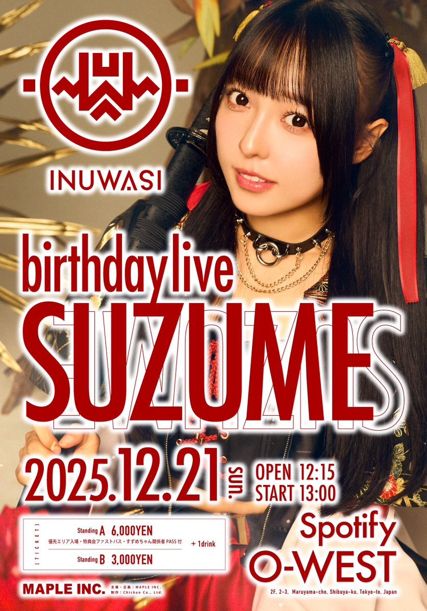 🐤生誕ライブ決定🐤 INUWASI birthday live - すずめ - 12.21(日) Spotify O-WEST OP12:15 ST13:00 FC先行受付 11.13(木)21:00-11.16(日)23:59まで 🎟️inuwasi.nff.ai/ticket A 6,000円(優先エリア・各特典付) B 3,000円 INUWASI すずめさん生誕ライブ決定🐥 必ずお越し下さい! #INUWASI