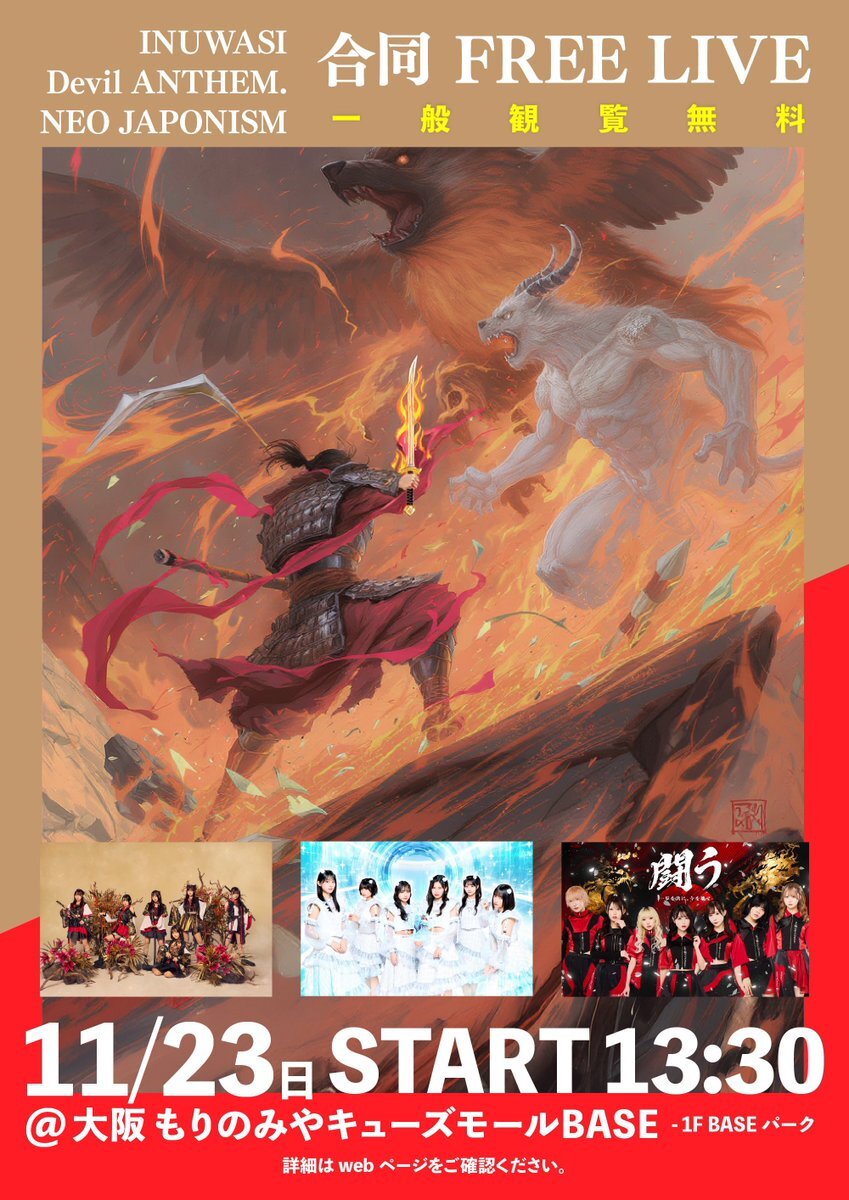 🐶🦅大阪FREE LIVE開催 INUWASI/Devil ANTHEM./NEO JAPONISM 合同FREE LIVE 11.23(日) フリー入場13:15 ST13:30 もりのみやキューズモールBASE 1F BASEパーク 🔥入場無料🔥 ▶︎ inuwasi.jp/event/detail.p… ※特典会はリリイベレギュ 大阪で合同FREE LIVE決定! 是非お越しください! #INUWASI