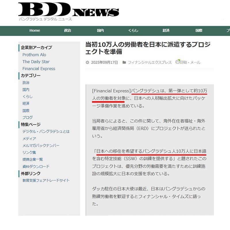 【拡散】🇧🇩バングラデシュは、日本への10万人規模の労働者輸出を目指し、日本政府・日本企業の支援で「ジャパンデスク」を設立。労働市場の需要マッピング、語学研修、雇用促進、品質管理などを担う。日本は2040年までに1100万人の労働力不足が予測され、バングラデシュの熟練労働者を歓迎し、介護など