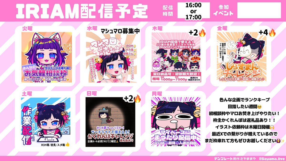 明日以降の配信スケジュールだよ! 時間は21時~にしてみた!いろいろと時間帯調整中〜 あとは朝雑談&作業配信は随時する予定だから良かったきてねー! 変更があったら随時連絡するね! #IRIAM新人ライバー #IRIAM繋がり隊 #IRIAMライバーと繋がりたい #IRIAMライバーさんと繋がりたい pic.x.com/nexXK1MgNM