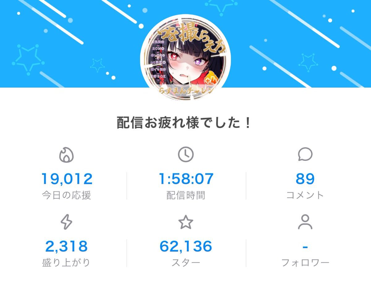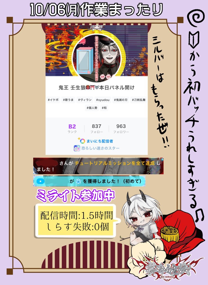 10/06㈪リザルト(^o^)丿 いつも配信前ってシャワーしてくつろいでから始めるんだけど、 昨日も安定のくつろぎながらスヤァ(ฅ ˘ω˘ ฅ)Zzz 寝起きで急に唄ってみたけど声でないねー( ゚Д゚) イリアムで初バッジを取ってもらえてとってもハッピーでした(●´ω`●) #壬生狼伝 #IRIAM個人勢 pic.x.com/B2gNmBhhMG