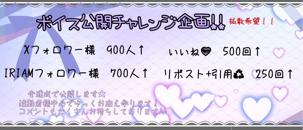 ✦・━・✦・━・✦・━・✦・━・✦・━・✦ #ボイス公開チャレンジ達成 ✦・━・✦・━・✦・━・✦・━・✦・━・✦ 無事公開できました! 僕の声はどうだったかな?想像通り? リプで感想待ってるよ‼️ XとIRIAMももう少しで立ち絵も公開できるので何卒よろしくお願いします!