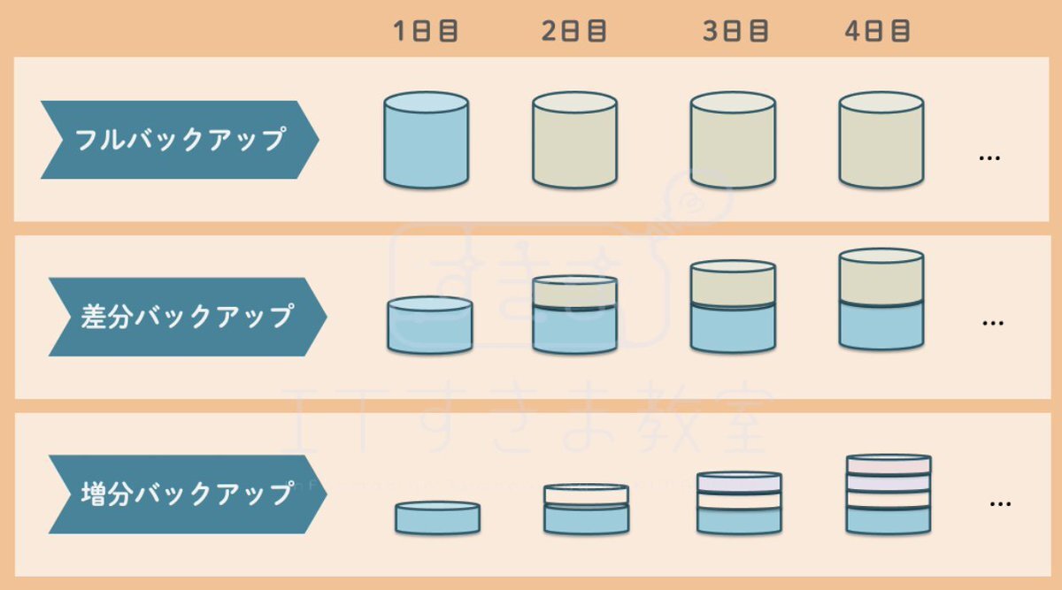 🔆バックアップの方法 ・フルバックアップ:常にデータ全量を取得 ・差分バックアップ:フルバックアップ後に追加・変更の差分をバックアップ ・増分バックアップ:フルバックアップ後、新たに追加・変更された増分のみをバックアップ #ITすきま教室 #ITパスポート pic.x.com/nXspeEhkuc