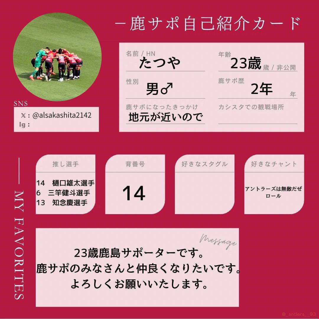 鹿島アントラーズファンです。 鹿サポの方と繋がりたいです。 自己紹介カードお借りしました #鹿サポ自己紹介カード #鹿島アントラーズ好き #鹿島アントラーズファン #鹿サポと繋がりたい #サッカー好きと繋がりたい #Jリーグ好きな人と繋がりたい pic.x.com/brctXWGyrq