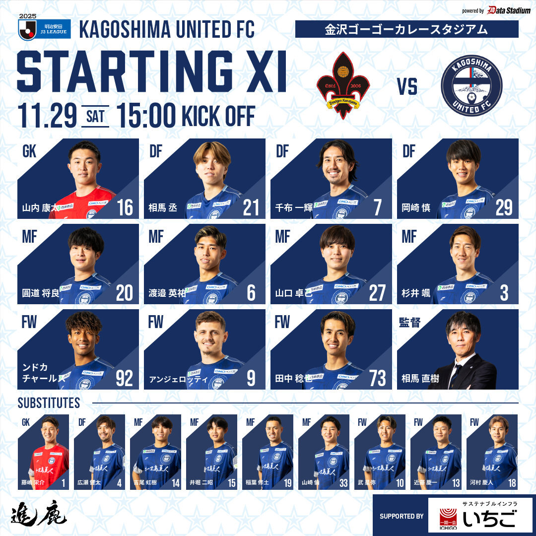 【明治安田J3リーグ 第38節】 🆚 #ツエーゲン金沢 【スターティングメンバー】 GK #山内康太 DF #相馬丞 #千布一輝 #岡崎慎 MF #圓道将良 #渡邉英祐 #山口卓己 #杉井颯 FW #ンドカチャールス #アンジェロッティ #田中稔也 #鹿児島ユナイテッドFC #進鹿 #金沢鹿児島