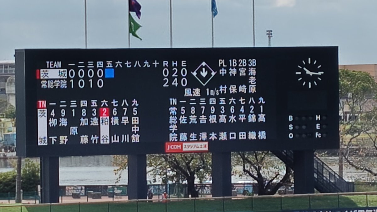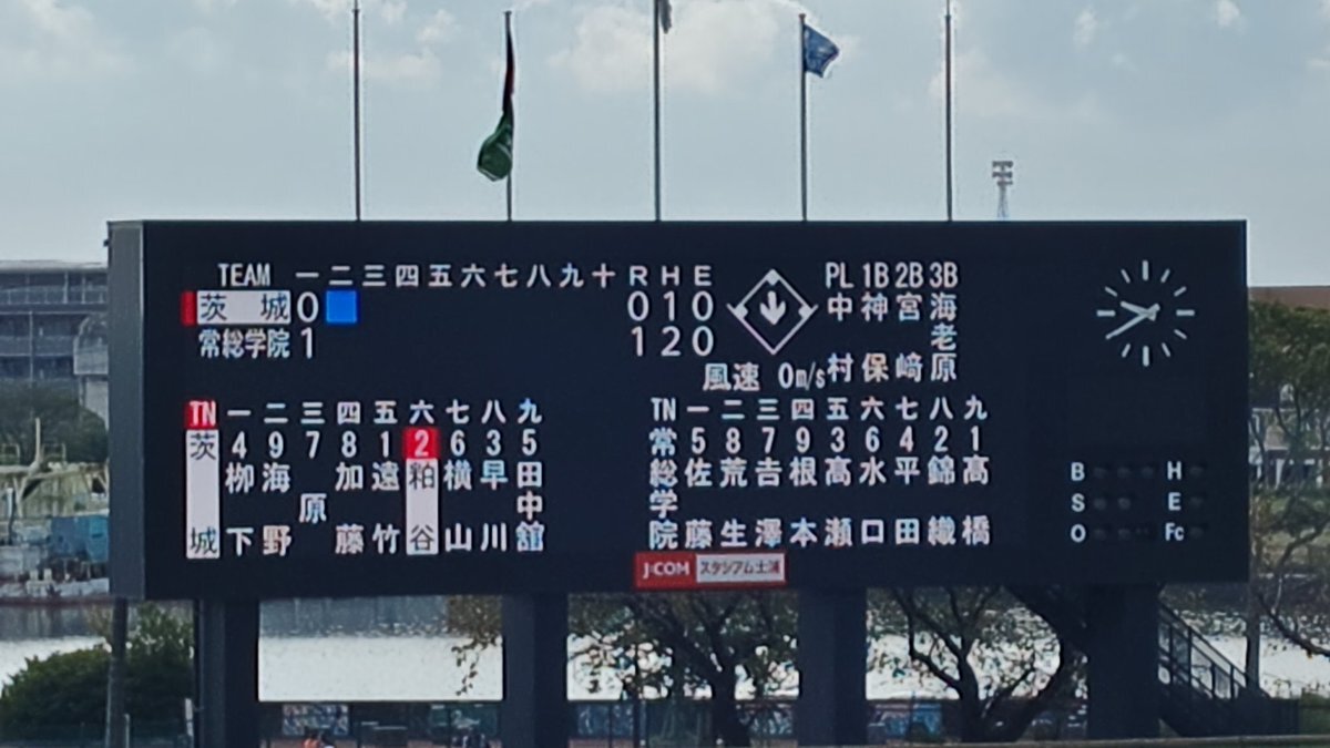 秋季茨城県大会3回戦 #茨城 0-2 #常総学院 (4回) 茨)遠竹-粕谷 常)高橋-錦織 佐藤くんの適時打で常総学院が1点追加。茨城も初回と3回に無死2塁のチャンスを作るも得点出来ず。給水タイムは無し💦 #高校野球 #茨城 #センバツ #JCOMスタジアム土浦 pic.x.com/Y33nTMQs9Z