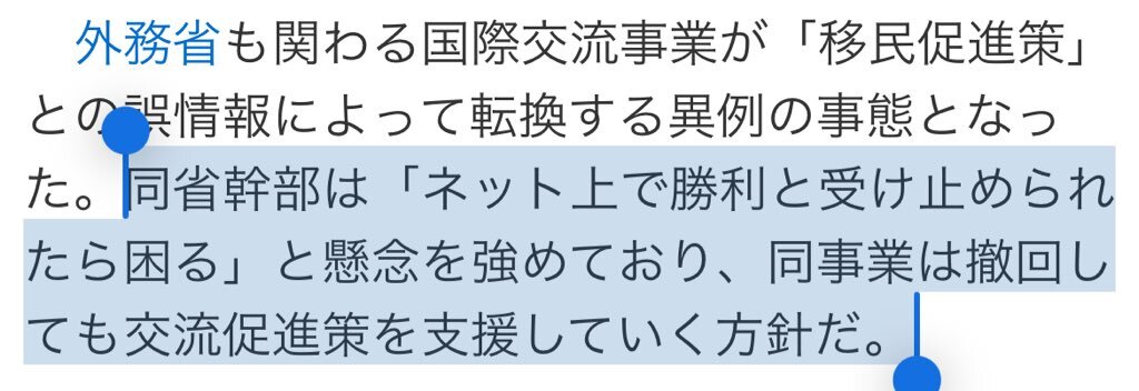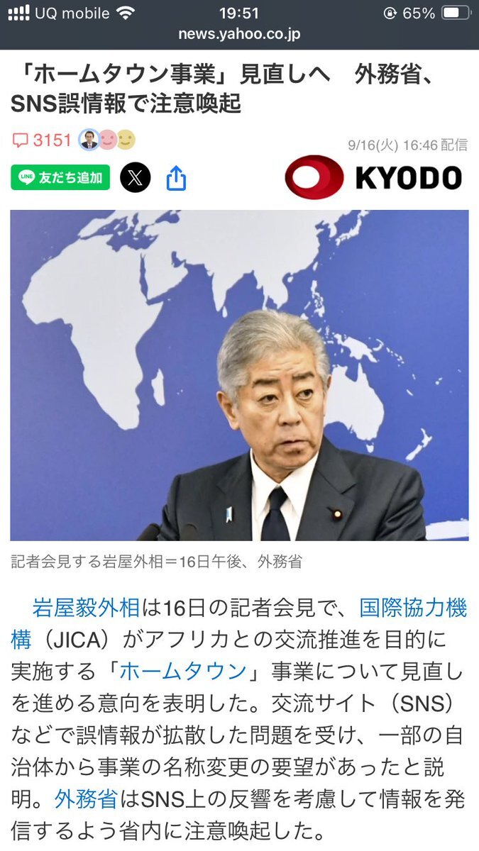 ⬜️JICAの「ホームタウン」に認定した交流強化事業をめぐり、SNSなどで事実と異なる情報が拡散し、抗議が殺到したことを受け、JICAがこの事業を撤回する方針を固めたnews.yahoo.co.jp/articles/745aa… 移民推進につながるプロジェクトだという指摘に対して今も頑なに誤解だと言い張ってるのが、本当に見苦しい。