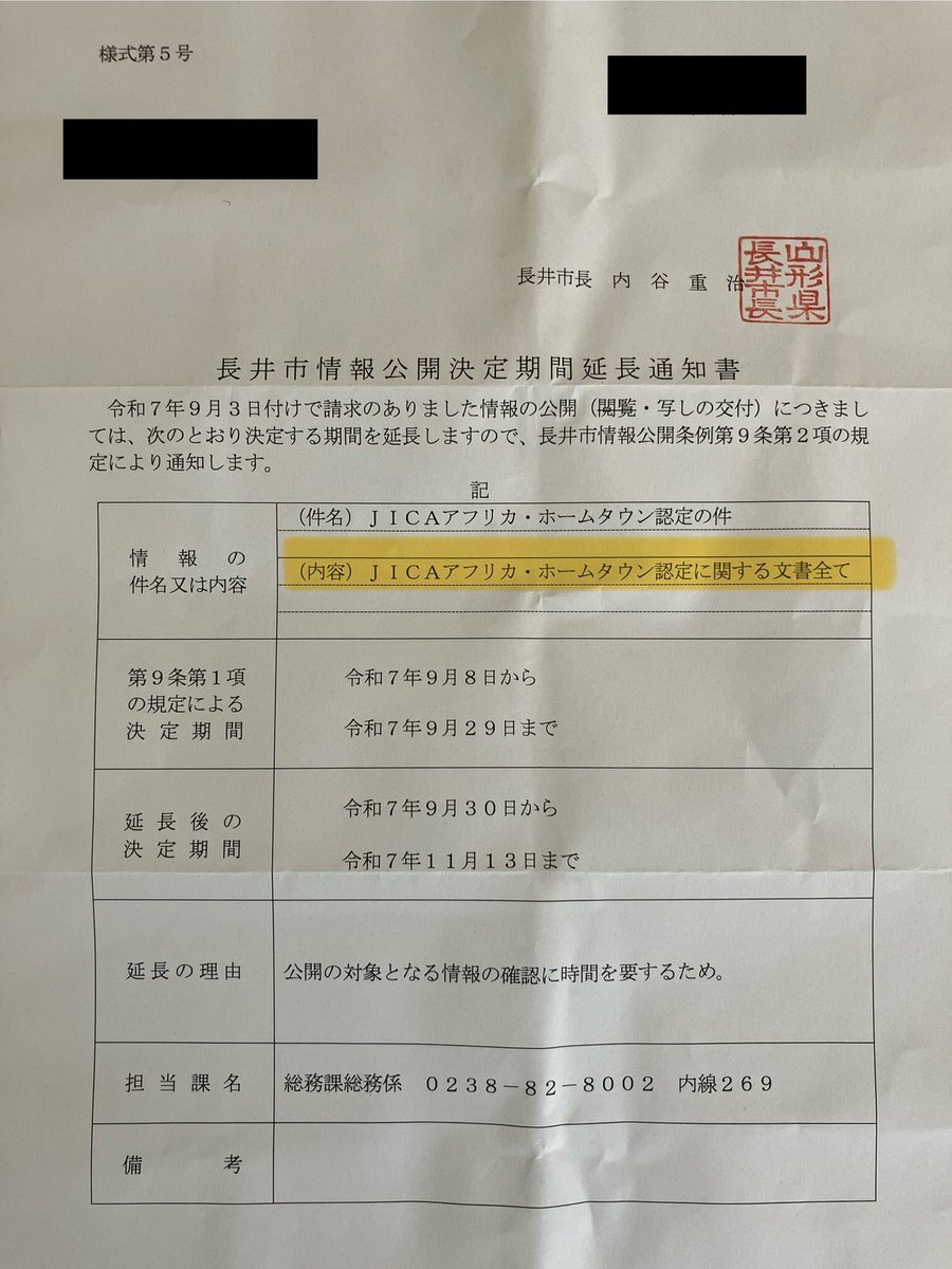🆕条例違反で出遅れた長井市、一発開示で逆転なるか!? 情報公開請求の結果 超拡散お願いします♻️ はい、皆さんお見込みのとおり伝家の宝刀「公開決定期間延長」 全員正解!🎯 長井市・今治市・三条市、 これでスリーカード完成🃏 #ホームタウン白紙撤回 名称変更もステルスもダメ!@nihontenguto