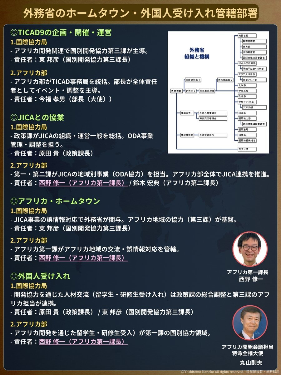 JICAホームタウンや外国人受け入れ政策を管轄している外務省の部署と責任者を調べました。責任者についてはあくまでも推定ですが部署についてはアフリカ部が担っていることはほぼ間違いないでしょう。 外務省エリート官僚のN氏については↓の動画で詳説しています。 x.com/ykaneko_x/stat…