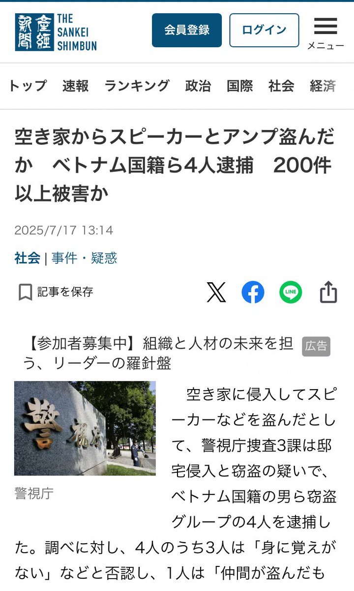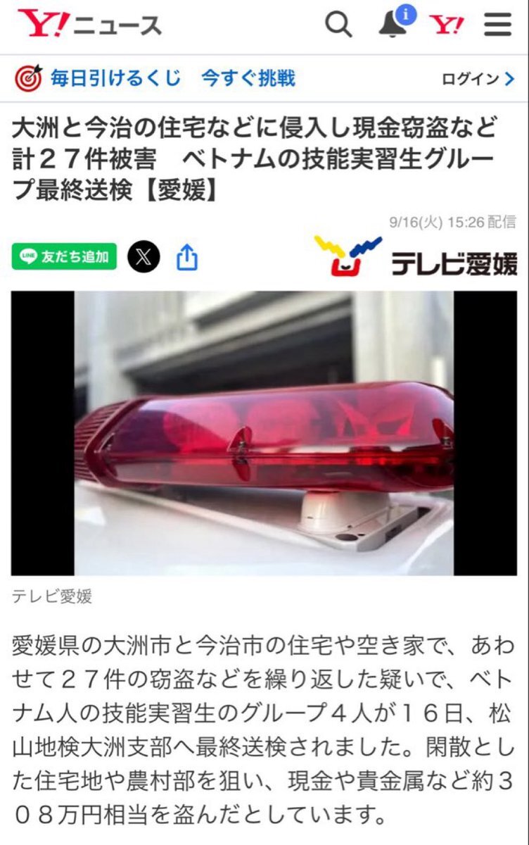 埼玉(関東)でも6〜7月に同じ様な事件がありました。 市からの防犯アラートが異様に増え、グループが逮捕された後も類似した事件が頻発に起きる様になりました。 (以前なら窃盗はたまに、鹿の出没注意くらいだった) #移民反対 #JICAアフリカ・ホームタウン白紙撤回 sankei.com/article/202507… pic.x.com/8aJlwypaZB x.com/nbwqszmg3qu2ys…