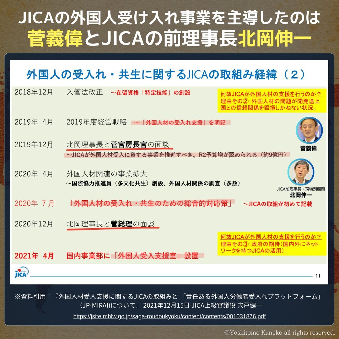 JICAの外国人受け入れ事業を主導した人物が判明しました。安倍菅政権時の菅義偉とJICA前理事長時代の北岡伸一です。2020年からJICAは『政府と外務省の特務機関』として「外国人受け入れ事業」を加速化させていったということです。