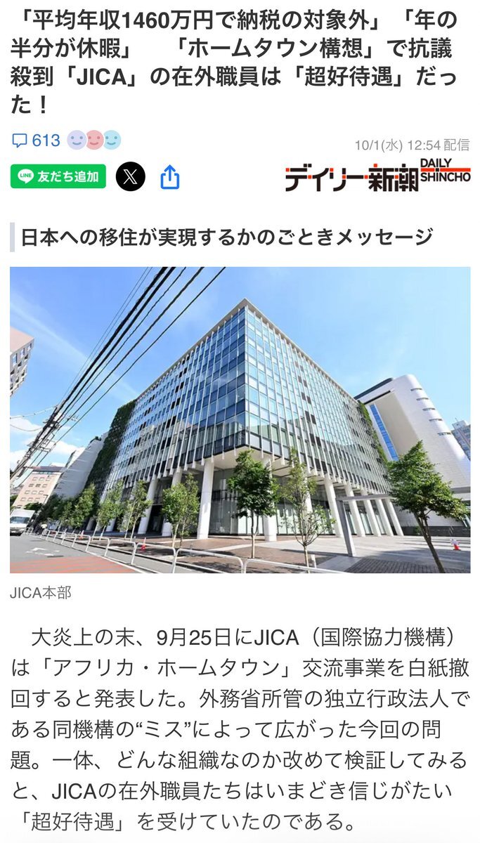JICA職員、年収1460万・休暇半年・税金免除。国民には増税と物価高を押し付け、公金チューチューか。これで国際貢献?今すぐ解体せよ! 「平均年収1460万円で納税の対象外」「年の半分が休暇」 「ホームタウン構想」で抗議殺到「JICA」の在外職員は「超好待遇」だった! news.yahoo.co.jp/articles/08bdb…